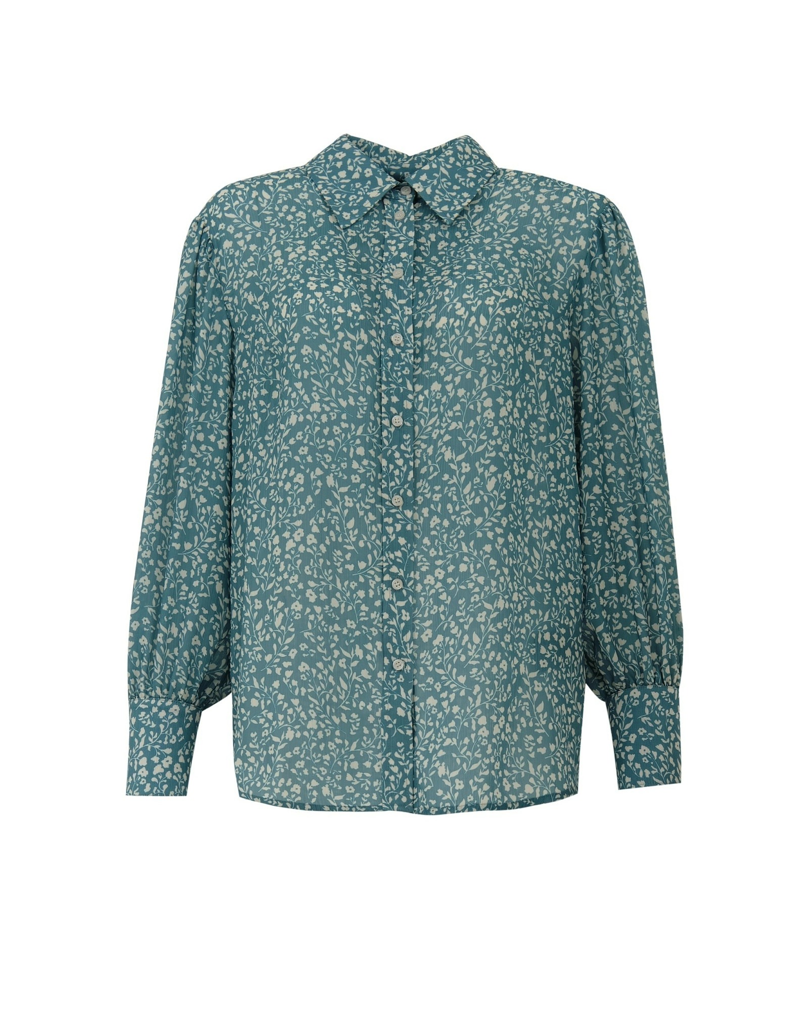 На сайте указаны российские размеры. Романтичная прямая блуза с отложным воротником бирюзового цвета с цветочным принтом из плательной ткани. Рост модели 175 см.
