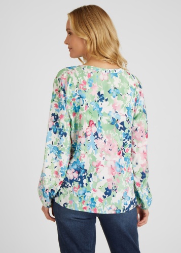 На сайте указаны российские размеры. Блузка впечатляет своим цветочным принтом по всей поверхности. Небольшой боковой разрез почти гарантирует идеальную посадку. Неброский воротник-стойка и V-образный вырез придают блузе дополнительную женственность. Сочетайте блузку с джинсами или небрежно с спортивными брюками. Рост модели 176 см. Длина по спинке от плеча для размера 46: 66 см.