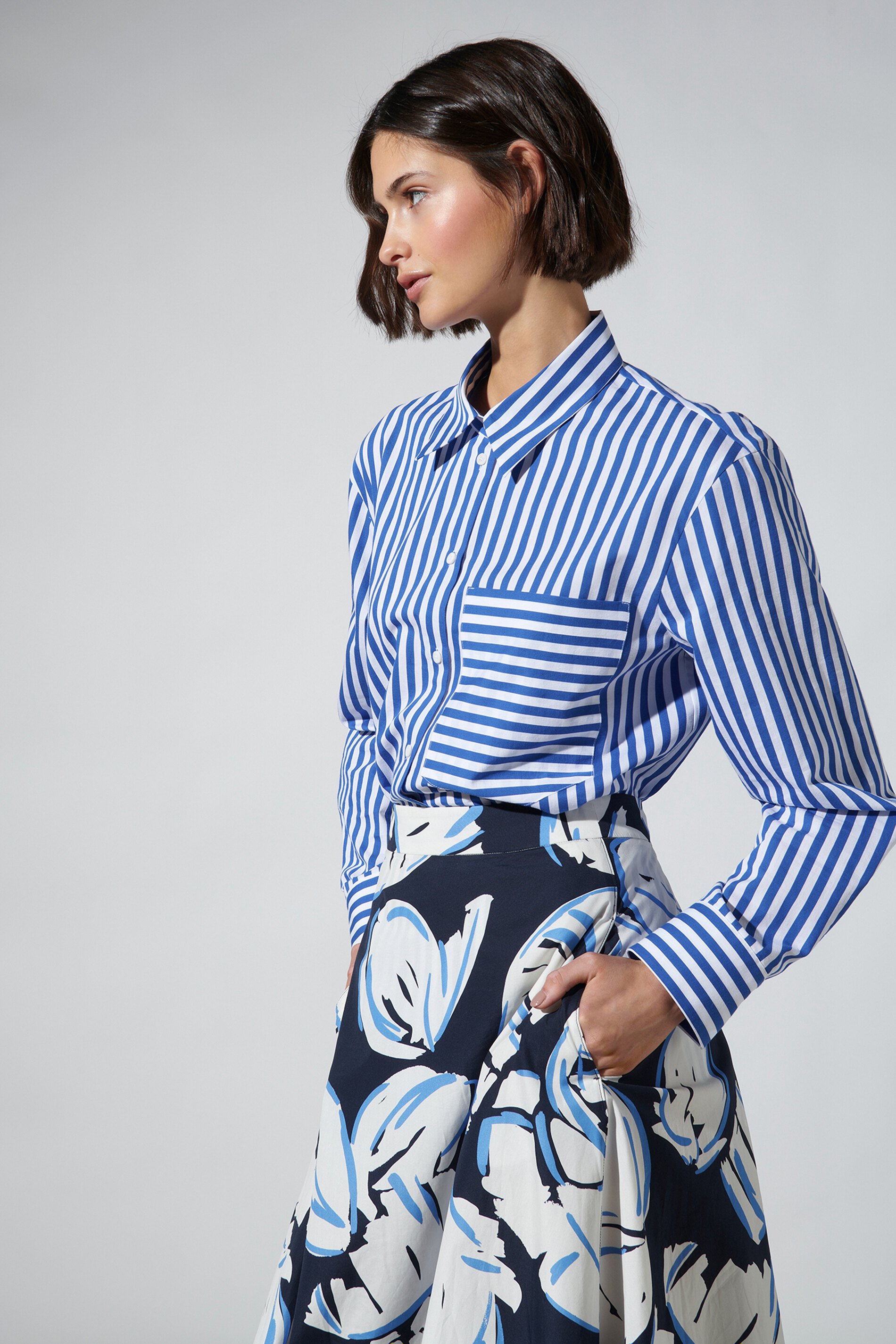 На сайте указаны российские размеры. Летняя рубашка из смесового хлопка с эксклюзивным и простым узором в полоску Positano, а также закругленным низом с боковыми разрезами. Спереди большой накладной нагрудный карман. Рост модели 178 см