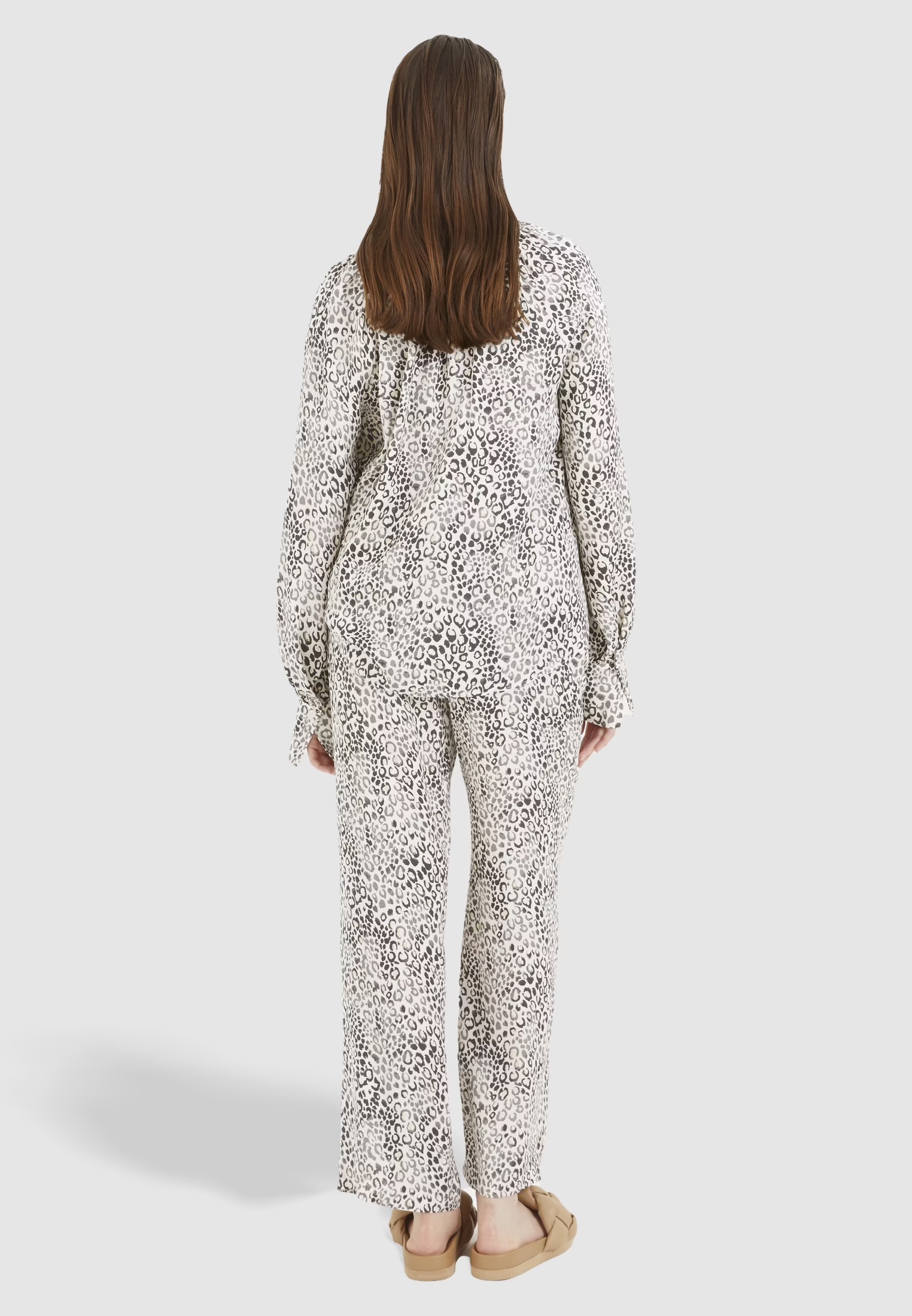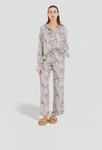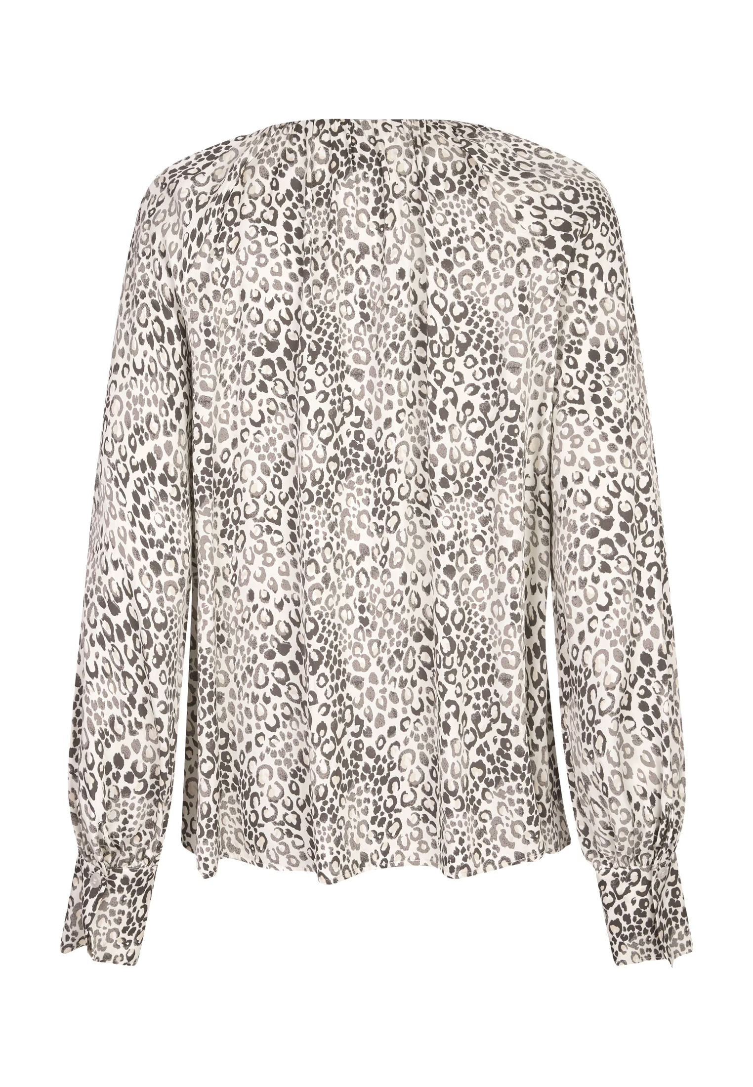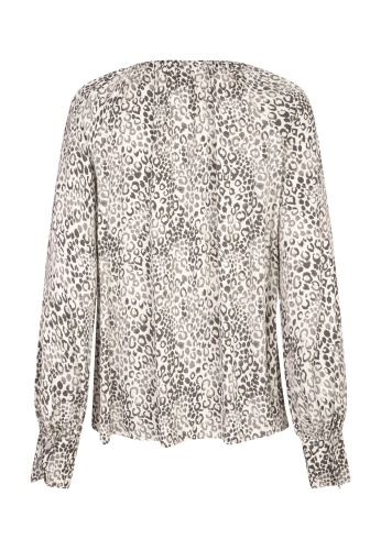 На сайте указаны российские размеры. Современный минималистичный леопардовый принт на этой свободной блузке привлекает внимание. Блузка с круглым вырезом имеет широкие манжеты, которые можно отвернуть, и рукава реглан. На вырезе горловины есть рюша.