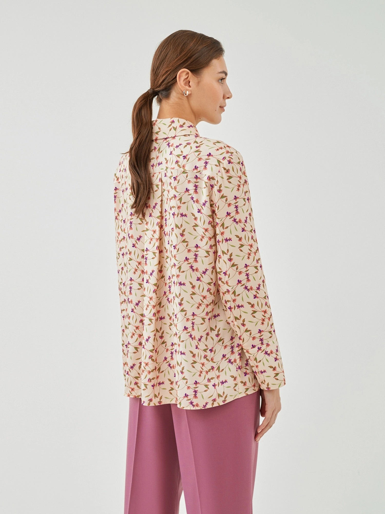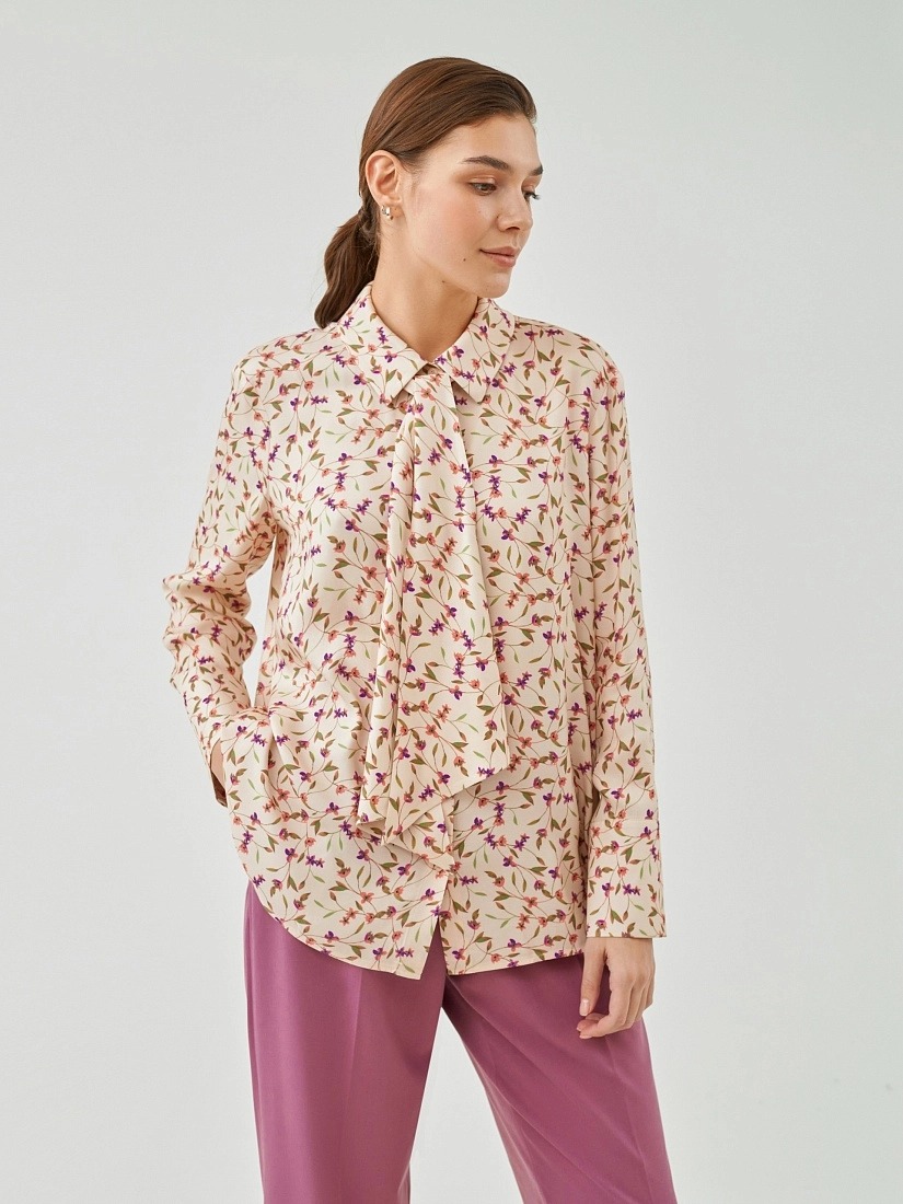 На сайте указаны российские размеры. Романтичная прямая блуза из вискозной ткани в цветочном принте. С отложным воротником и шарфом-галстуком. Составит идеальный романтичный комплект с юбкой из этой же ткани. Рост модели 175 см.