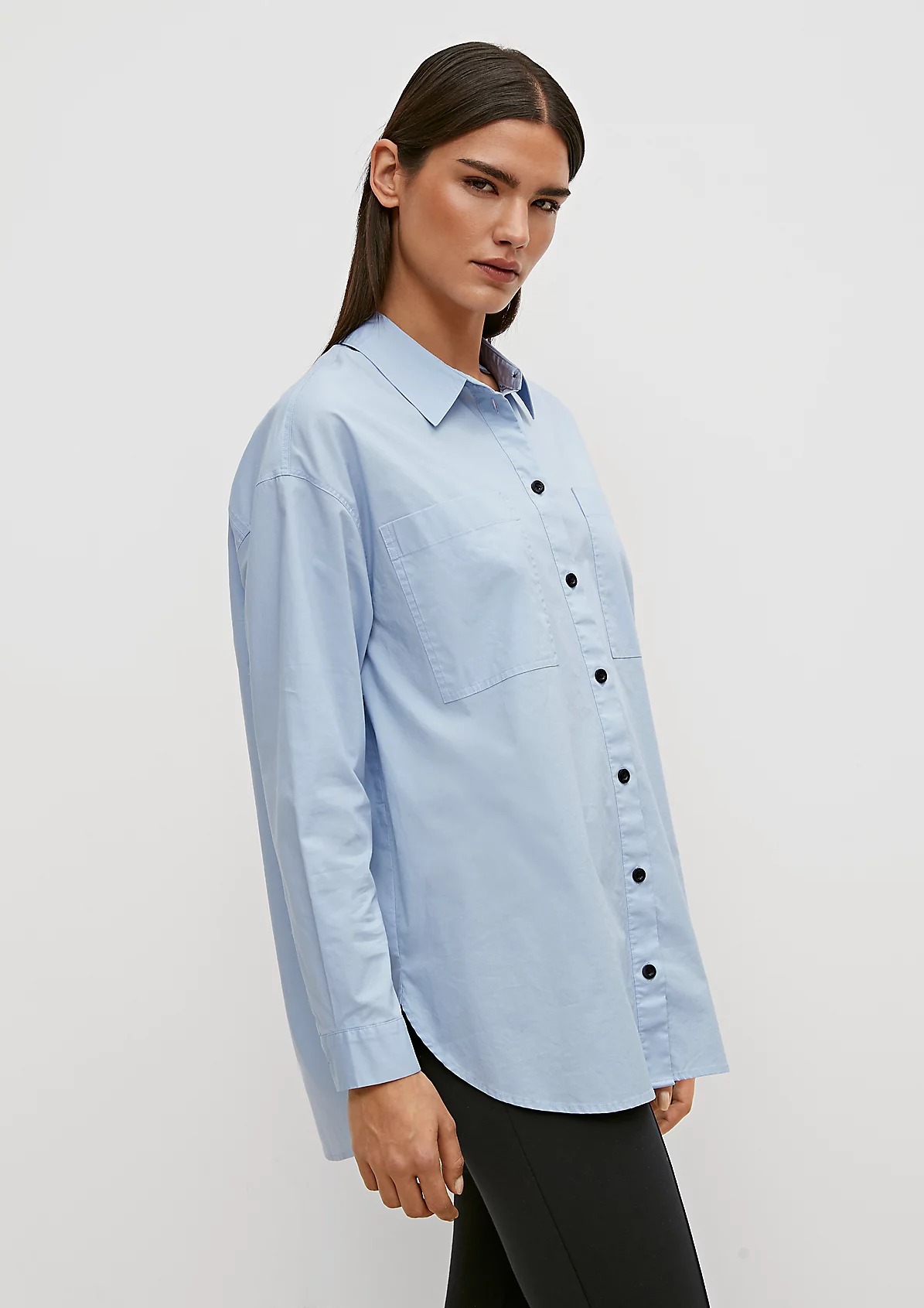 На сайте указаны российские размеры. Блуза свободного кроя с разрезом сбоку и закругленным низом. Заниженная линия плеча, длинные рукава, манжеты. Длина спины 81 см в размере 42 Рост модели 177 см.
