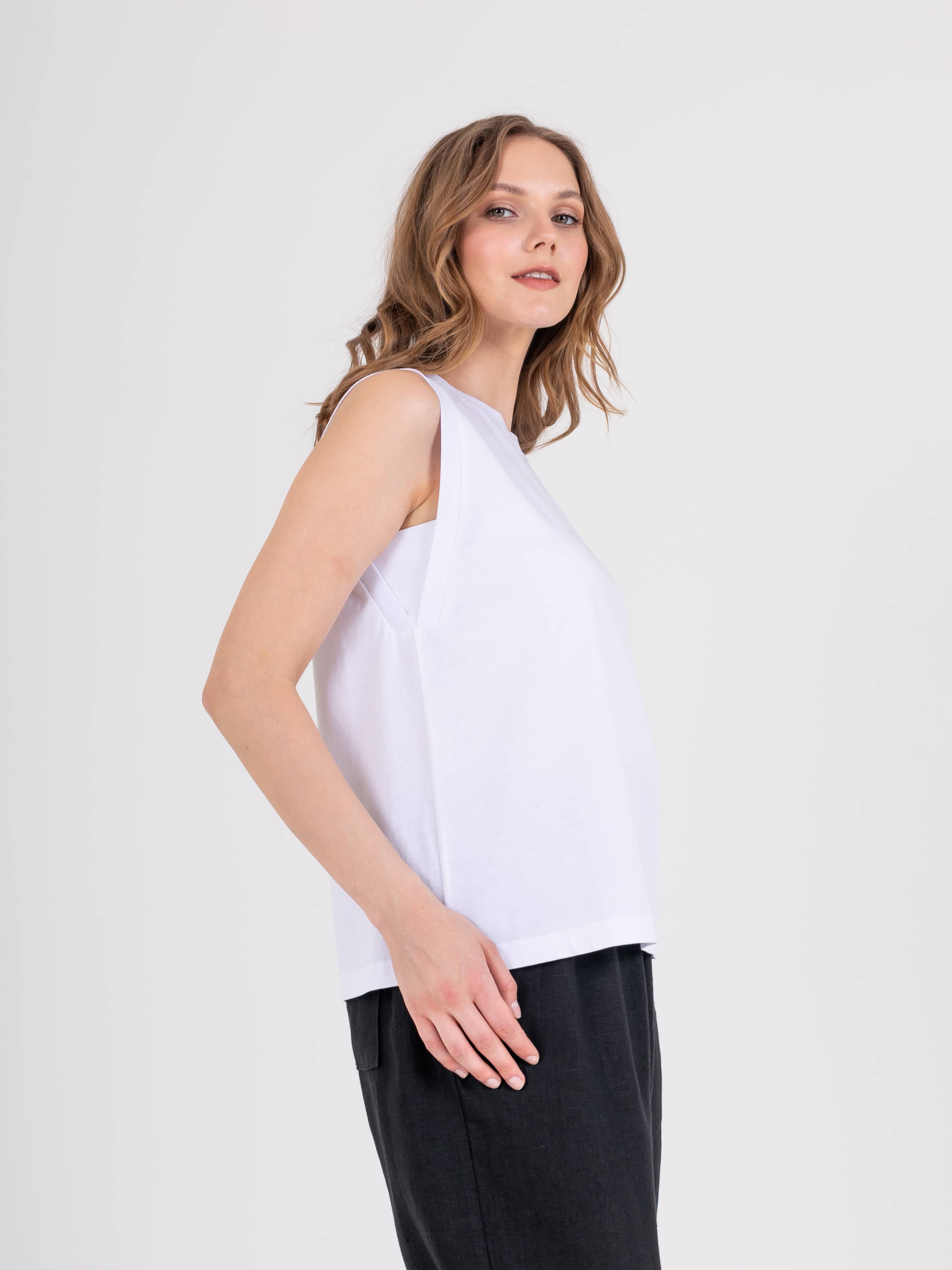 Нежный топ средней длины прямого силуэта из легкого 100% хлопка, с углубленной проймой и вставками. Круглый вырез горловины.