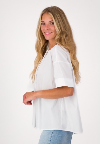 Летняя блузка изготовлена из органического хлопка и поэтому отличается не только высочайшим качеством, но и мягкостью и особенно приятной на ощупь. Планка с потайными пуговицами придает блузке элегантный вид, а тонкая складка сзади обеспечивает дополнительную свободу движений и привлекает внимание. Широкие манжеты рукавов придают блузке нотку изысканности, а красивая драпировка блузки создает женственный силуэт.