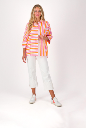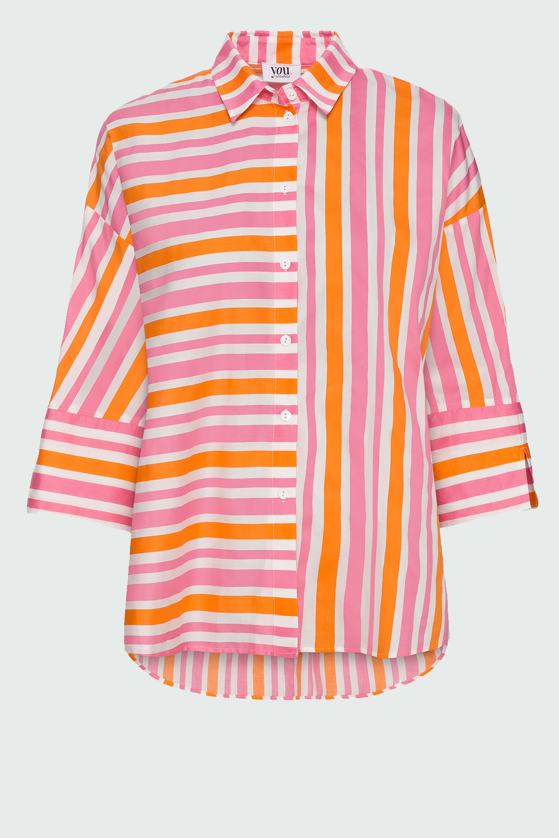 Полосатая хлопковая блуза с рубашечным воротником и рукавами ¾ станет прекрасным дополнением к вашему гардеробу. Он имеет вертикальные и горизонтальные полосы, которые придают ему уникальный и вневременной вид. Поскольку полосы расположены разной ширины, они создают интересный и динамичный образ. Мягкая и легкая ткань обеспечивает приятный комфорт для кожи и поэтому идеально подходит для теплых месяцев.