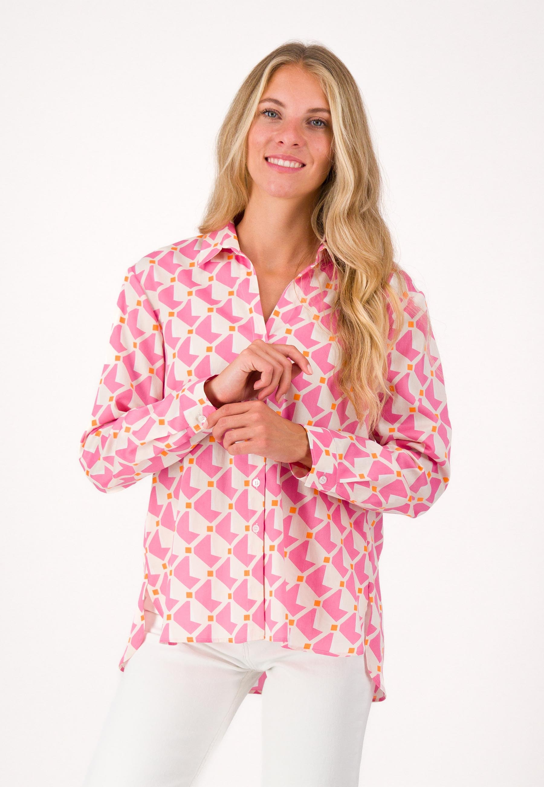 Отличным выбором для летних месяцев станет свободная блуза с отложным воротником и геометрическим узором. Изготовлен из 100% хлопка, удобен в носке и приятен на ощупь. Свободный крой также обеспечивает большую свободу движений и является идеальным выбором, особенно в теплое время года. Сочетайте блузку с блейзером для офисного образа или небрежно с джинсами, в ней вы всегда будете чувствовать себя комфортно.