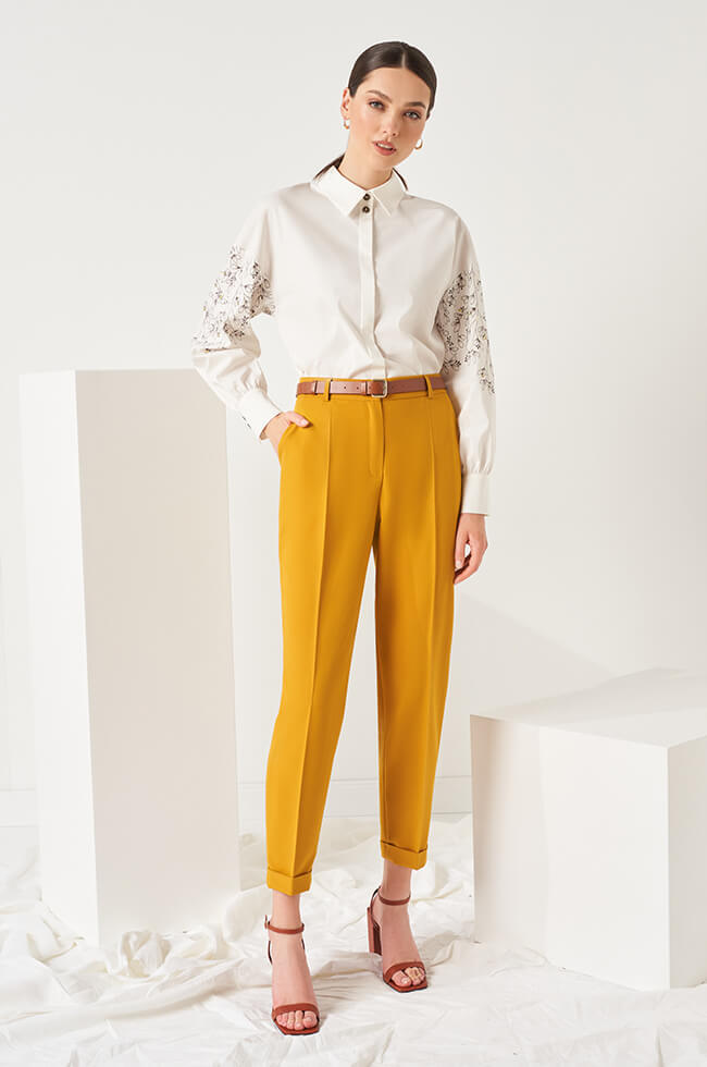 Блузка-рубашка свободного силуэта. отложной воротник-стойка, центральная потайная застежка на перламутровые пуговицы. Спущенная линия плеча, рукава декорированы дизайнерским принтом с бусинами и пайетками. Рукава сосборены на манжеты с разрезом и застежкой на пуговицы. В шов манжеты заложены складки. Спинка и перед с плавным закруглением по низу.
