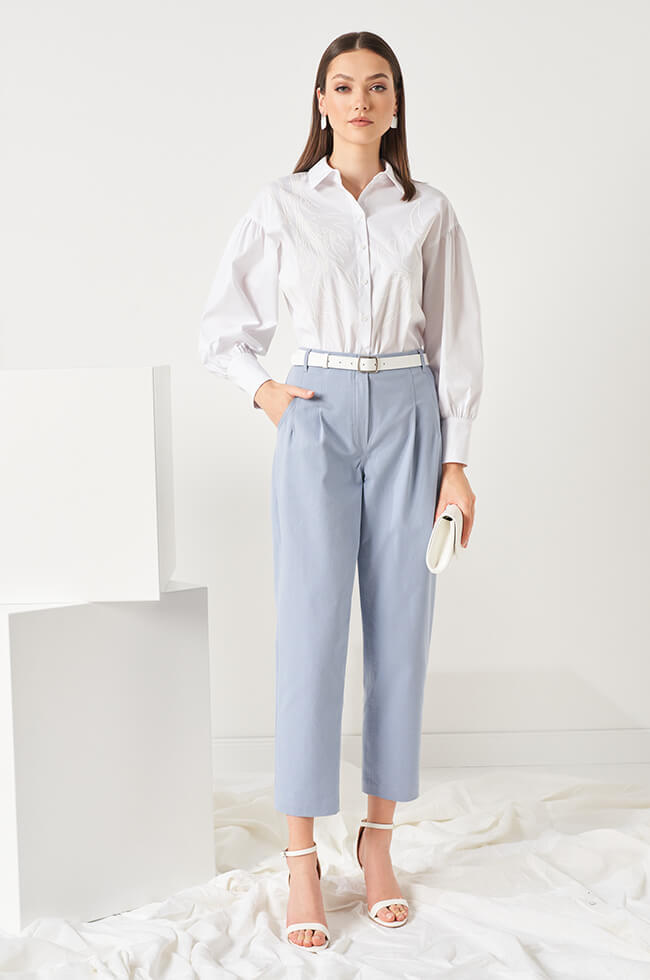 Блузка-рубашка свободного силуэта, отложной воротник-стойка, центральная застежка на пуговицы. Спущенная линия плеча, объемные рукава сосборены на высокие манжеты с разрезом и застежкой на пуговицы. В шов манжеты заложены складки, в боковых швах выполнены разрезы. Спинка с кокеткой. Спереди выполнен дизайнерский принт в тон «Флора».