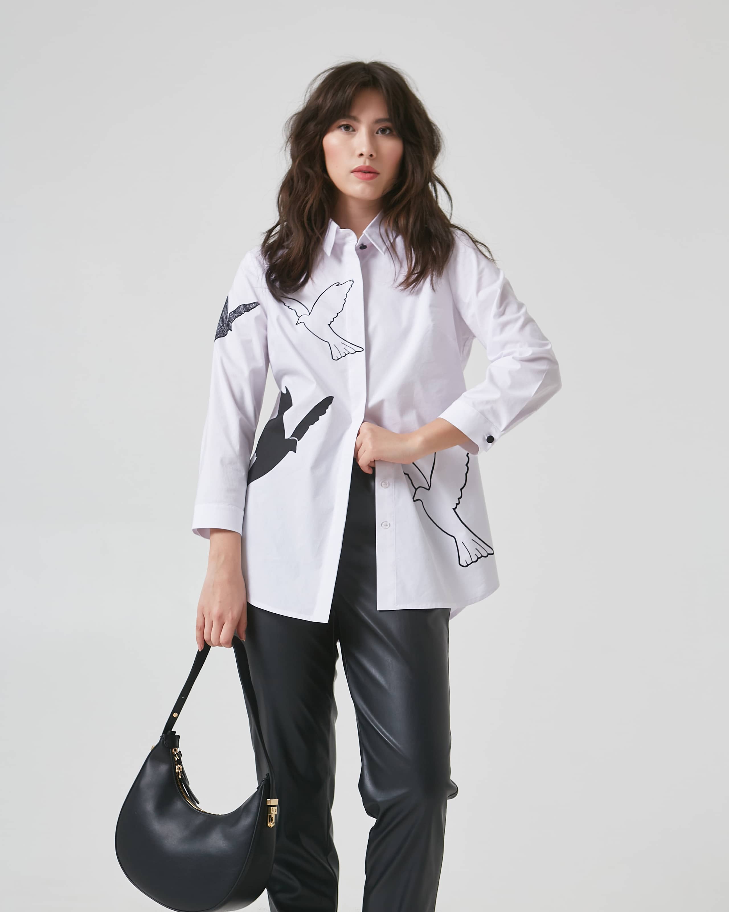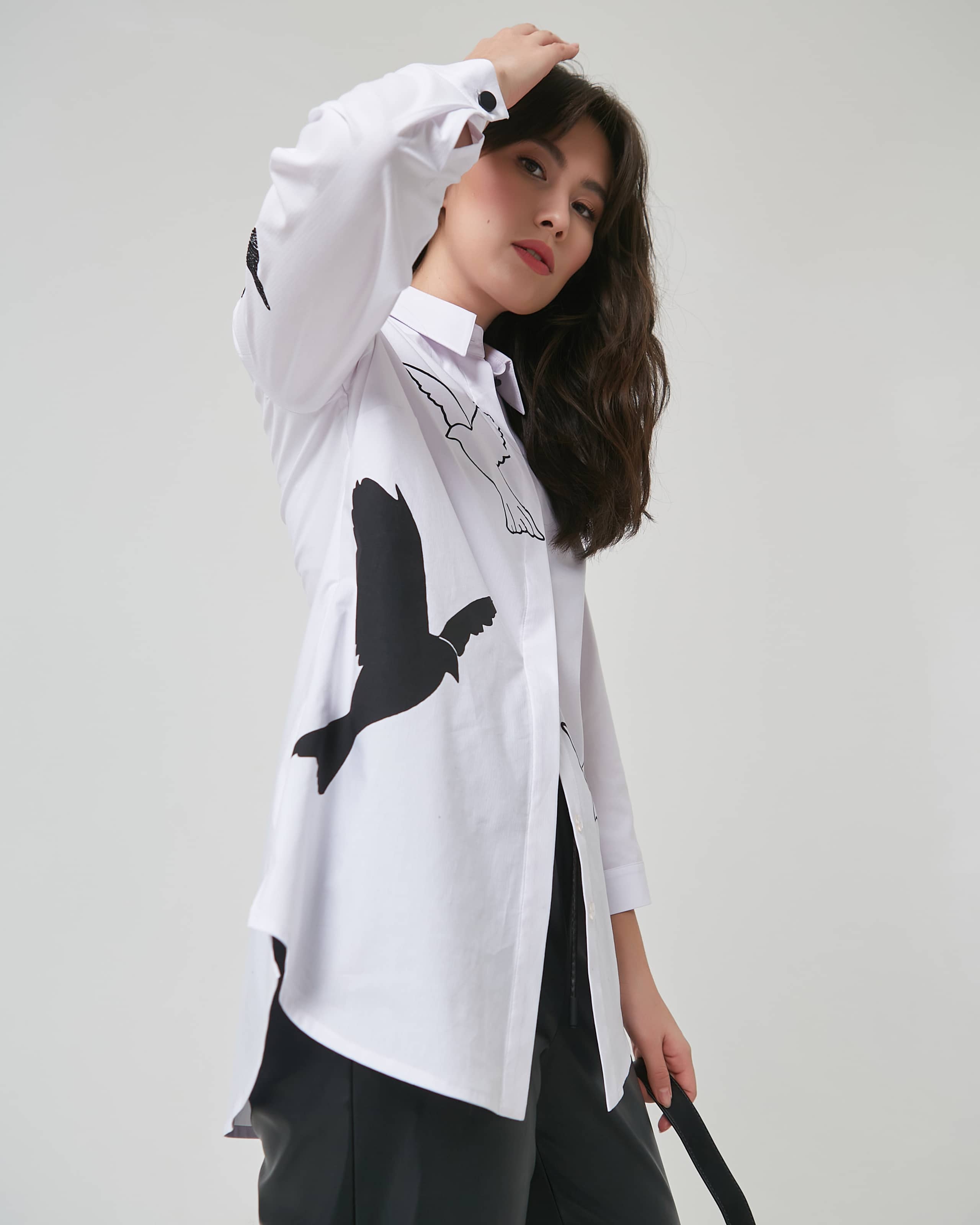 Удлиненная рубашка прямого силуэта с разрезами в боковых швах, дизайнерская особенность модели - графичный принт. Перед с двумя вытачками на выпуклость груди, идущими из боковых швов. Застежка потайная на 10 пуговиц. Длинные втачные рукава с манжетами, прорезными петлями и пуговицами. Стояче-отложной воротник.