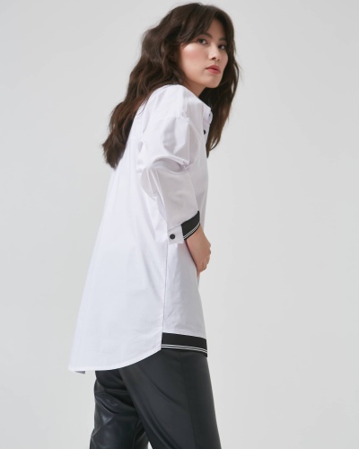 Удлиненная рубашка прямого силуэта с разрезами в боковых швах и ассиметричной линией низа, дизайнерская особенность модели - контрастные элементы: кнопки, декоративная резинка на манжетах, кант по низу и графичный принт в области груди. Перед с двумя вытачками на выпуклость груди, идущими из боковых швов. Застежка на 12 кнопок. Длинные втачные рукава со спущенной линией плеча и манжетами на прорезные петли и пуговицы. Стояче-отложной воротник.