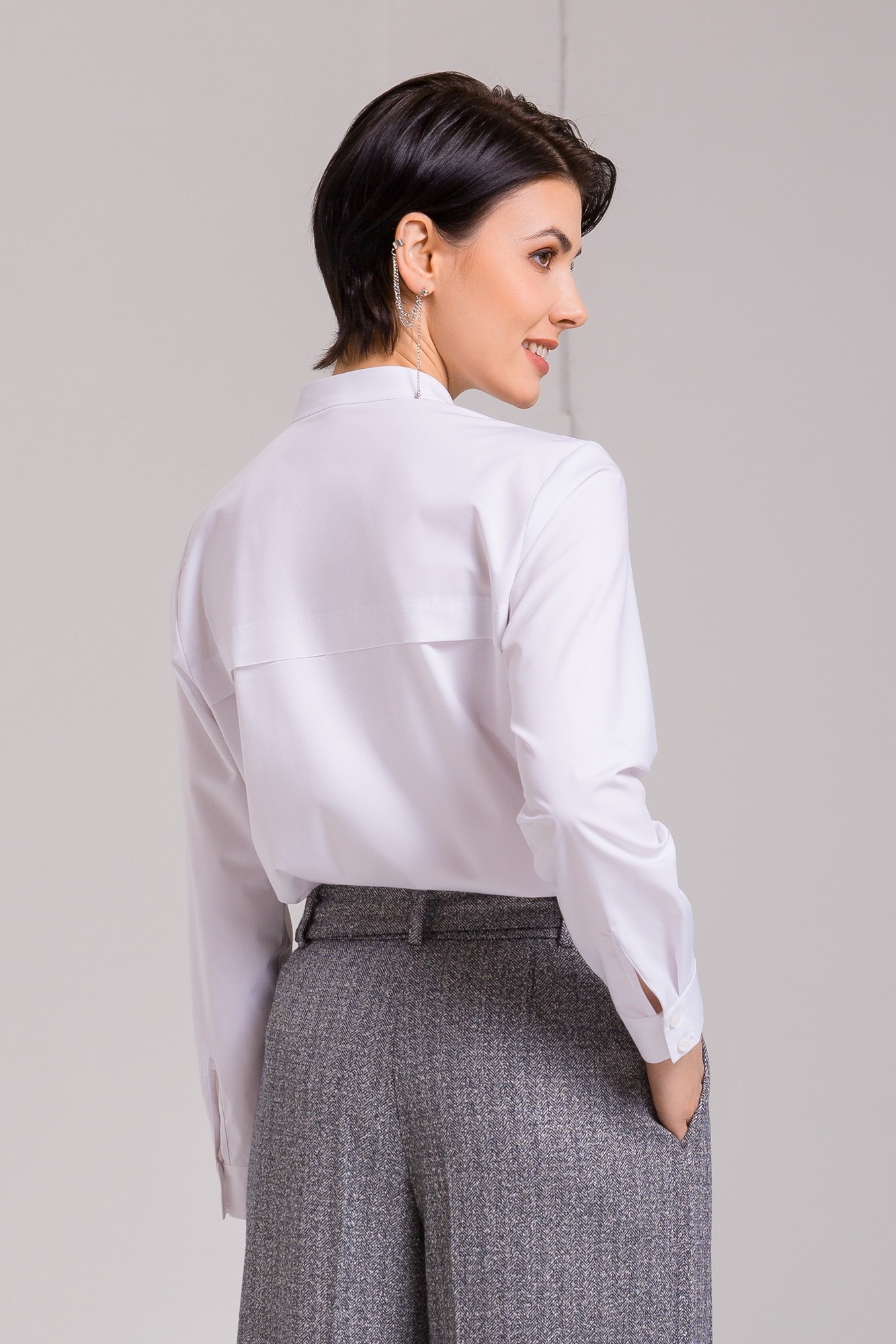 Вариант белой блузы, необходимой каждому гардеробу. Универсальная полуприталенная модель.
