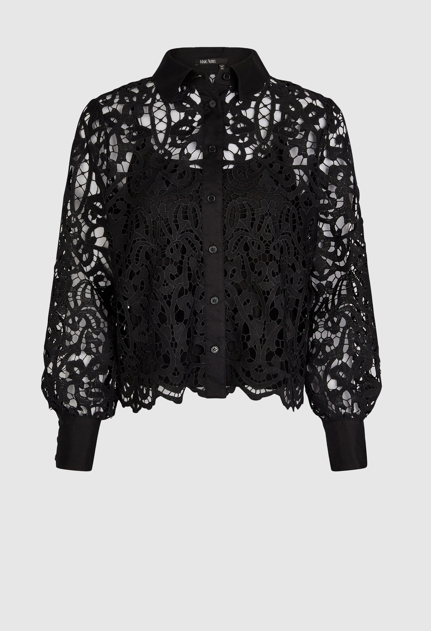 Кружевная блузка с деталями из поплина и эффектным мягким кружевом дополнена подходящим топом-спагетти в тон. Это создает образ с вау-эффектом. Продуманные детали, такие как подол с фестончатым краем и манжеты с разрезом, гармонично дополняют благородный дизайн.