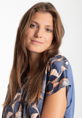 Свободная блузка-рубашка с современным графическим принтом и плиссированной деталью на вырезе. Прямая, свободная форма со спущенными плечами, круглый вырез горловины со складками спереди, сзади немного длиннее, чем спереди. Передняя часть из струящейся ткани. Спинка из мягкого вискозного трикотажа дымчато-синего цвета. Длина по размеру 42 - 64 см.
