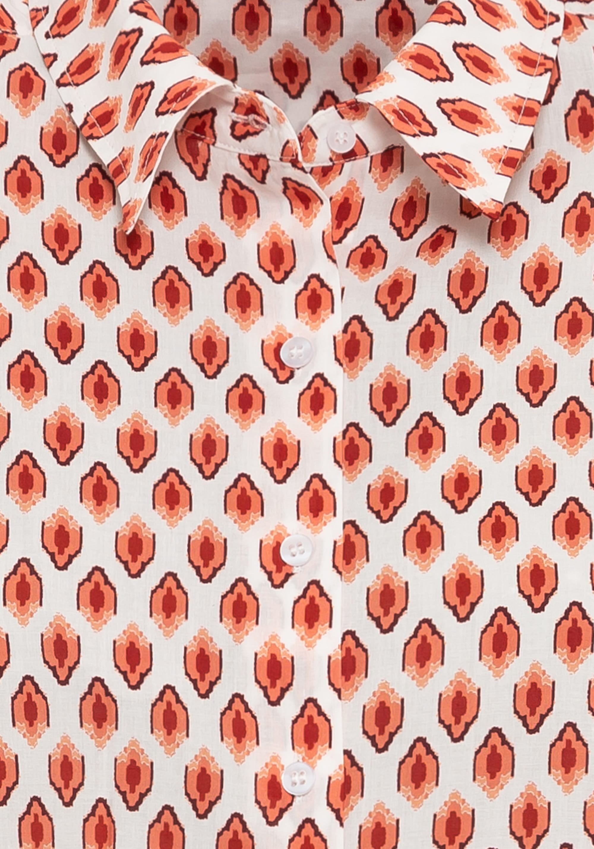 Классическая рубашка с эффектным геометрическим узором по всей поверхности в теплых осенних тонах. Отложной воротник, планка на пуговицах спереди, пуговицы на манжетах и складка на кокетке сзади.