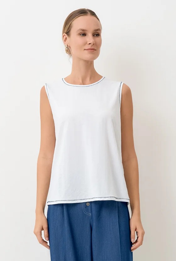 Блуза-топ A-образного силуэта. Горловина лодочкой. Проймы, горловина и низ блузы обработаны декоративной строчкой контрастными нитками.