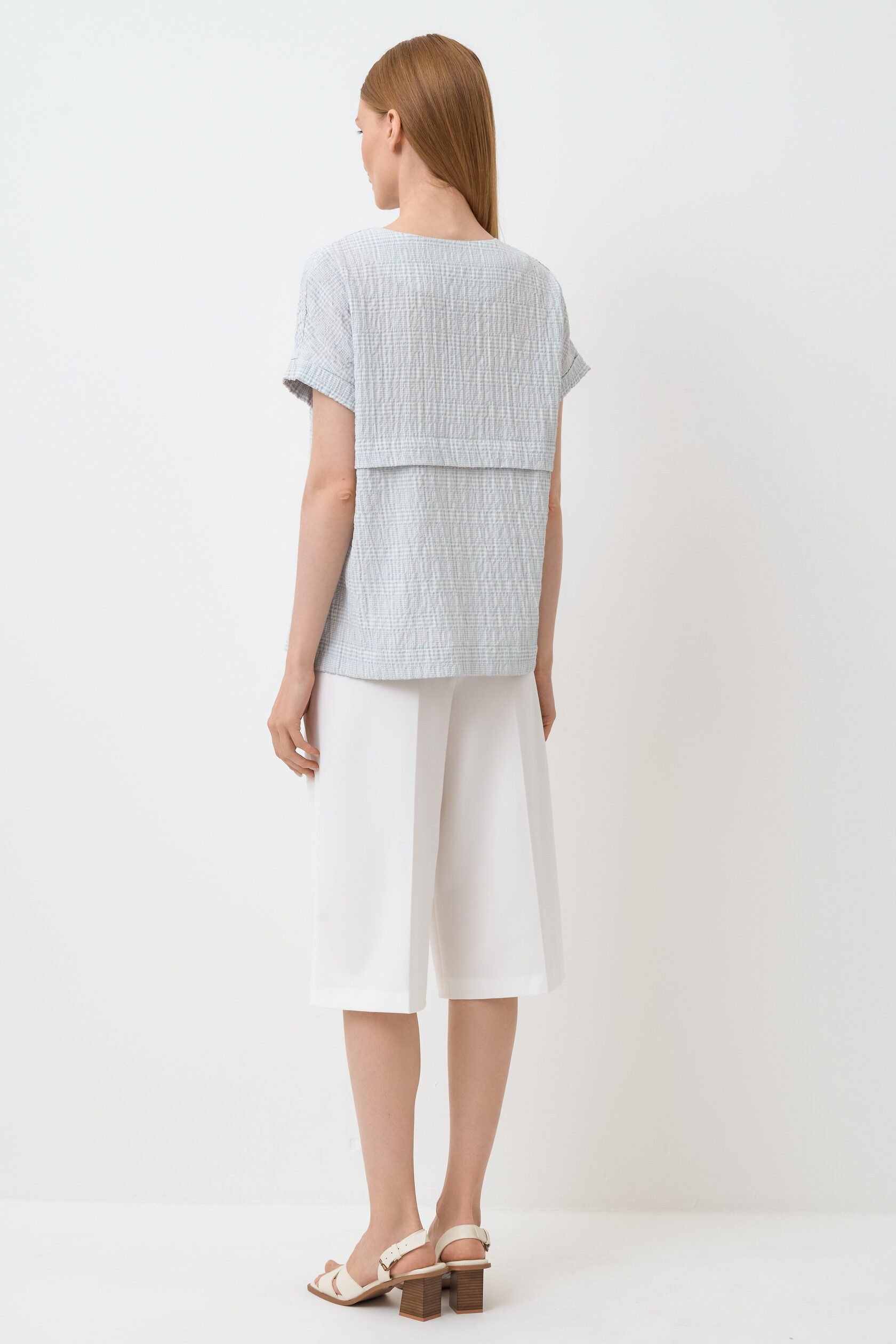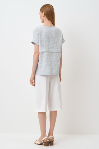 Блуза прямая, свободная. Горловина круглая. Застежка потайная на пуговицы и петли. Плечо спущенное. Манжет короткого рукава с отворотом. По спинке отлетная складка.