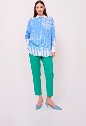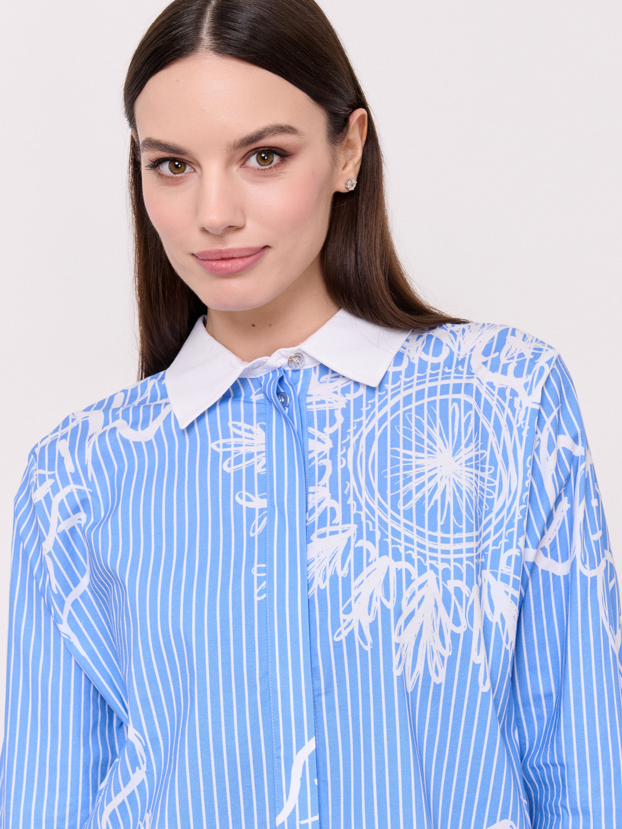 Детали: застежка пуговицы, вырез горловины отложной воротничок, рукава длинные с манжетами на пуговице, покрой прямой, рисунок полоска и абстракция, боковые разрезы. Длина по спинке: 76 см.