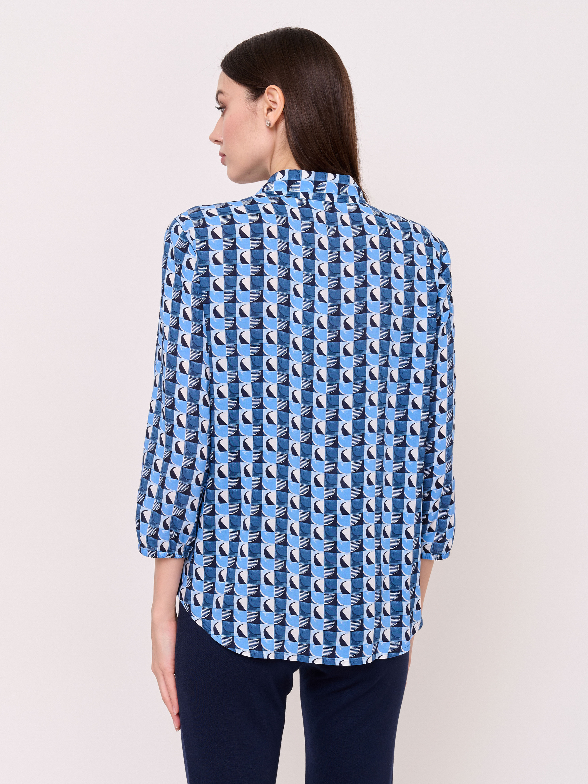 Детали: застежка пуговицы, вырез горловины отложной воротничок, рукава длинные, покрой рубашечный, рисунок орнамент. Длина по спинке: 65 см.