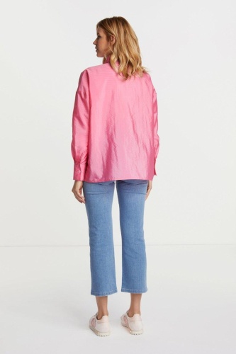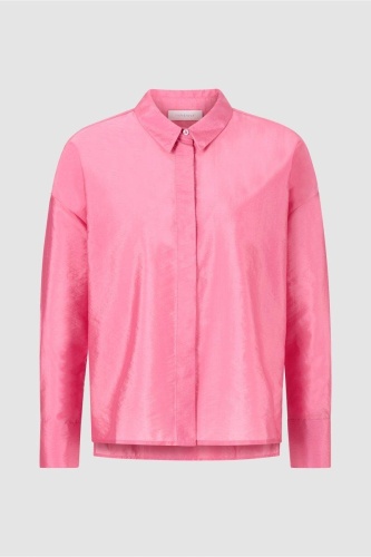Однотонная блузка свободного кроя из парашютного шелка с мятым эффектом. Планка на потайных пуговицах, воротник и рукава с манжетами добавляют классический акцент. Блуза имеет разрезы по бокам и удлиненную спинку. Длина для размера 42: 68 см. Окружность груди для размера 42: 124 см.