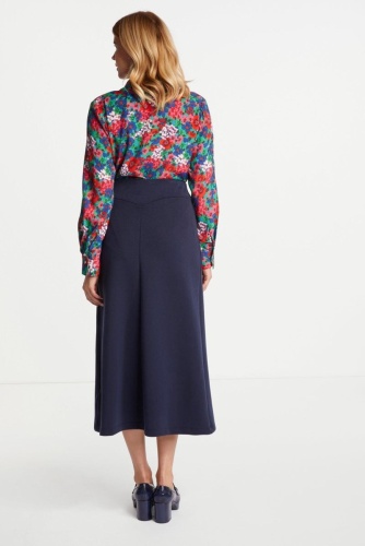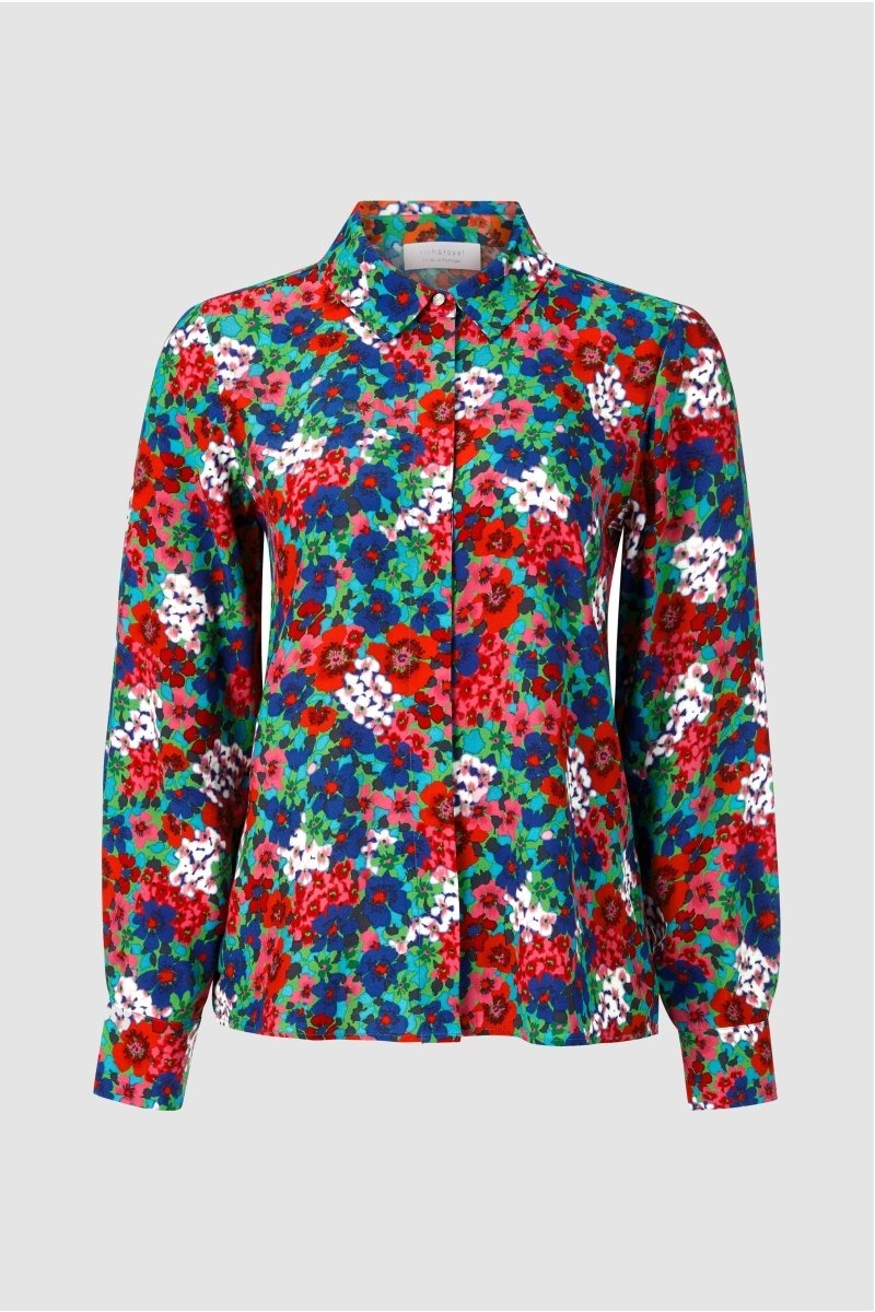 Блузка создает привлекательный цветочный образ. Воротник, планка с потайными пуговицами и манжеты на пуговицах придают изделию классический вид. Длина для размера 42: 66 см. Окружность груди для размера 42: 92 см.