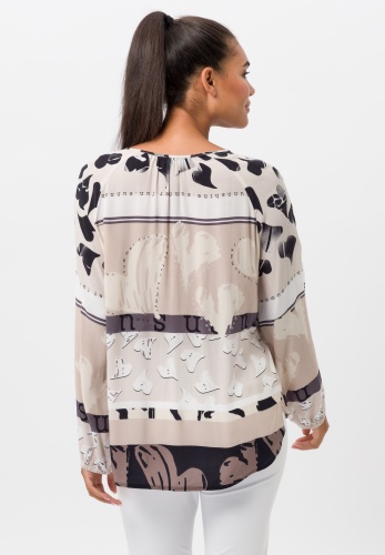 Блуза с рукавами-кимоно. Модель акцентна с помощью захватывающего сочетания узоров. Дикое сочетание узоров проявляется благодаря приглушенной цветовой гамме. Крой блузки слегка расклешенный, ткань - шелковистая комбинация купры и вискозы. Помимо длинных рукавов реглан на резинке, блузка имеет вырез-тунику на завязках. Длина в 42 размере - 68 см.