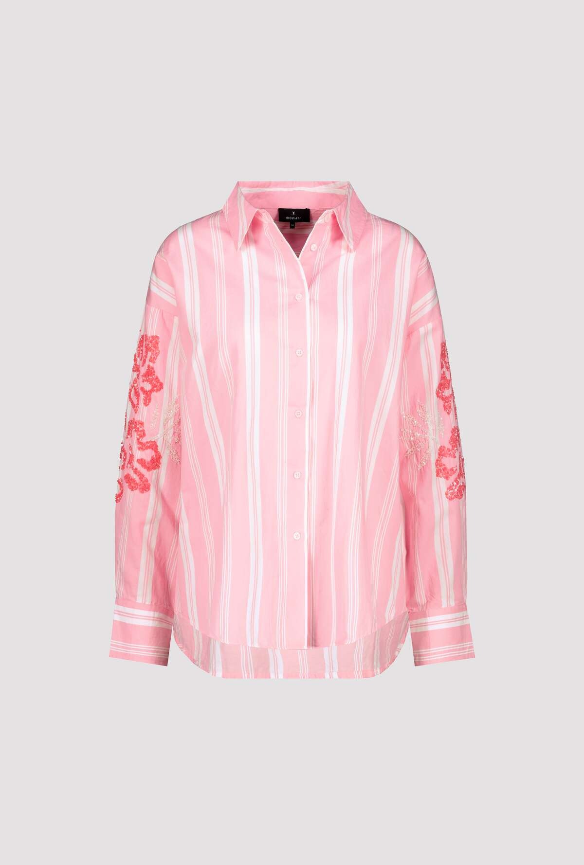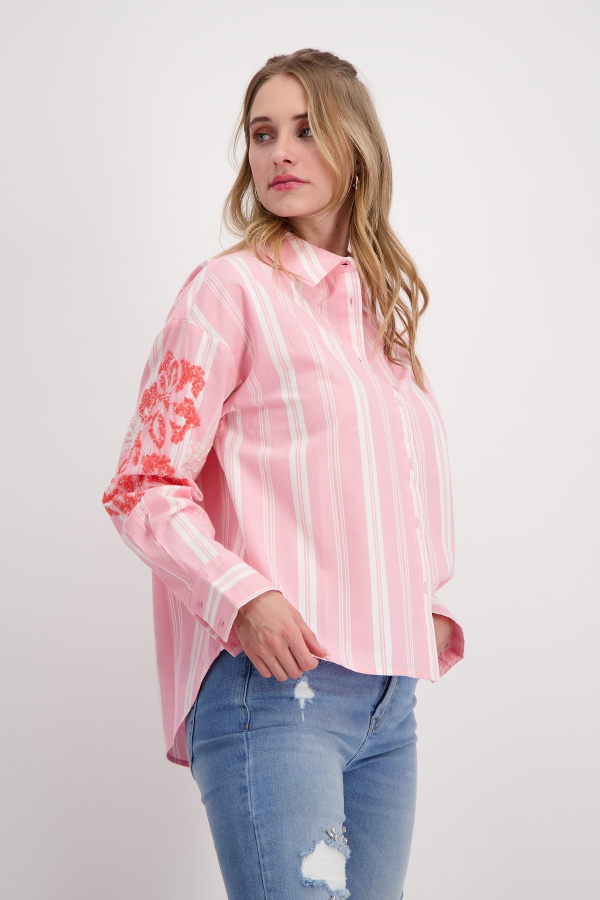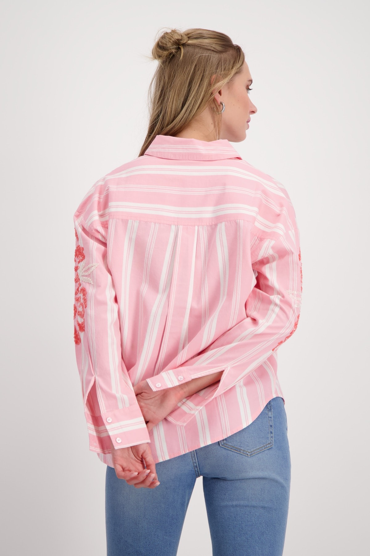 Блузка изготовлена из 100% хлопка и имеет полосатый дизайн с цветами из пайеток на рукаве. Регулярная посадка. Воротник рубашки. Подол рукава с манжетами. Лента для пуговиц. Удлиненная, закругленная спина. Длина спинки 44-го размера составляет 70 см, длина переда 66 см.