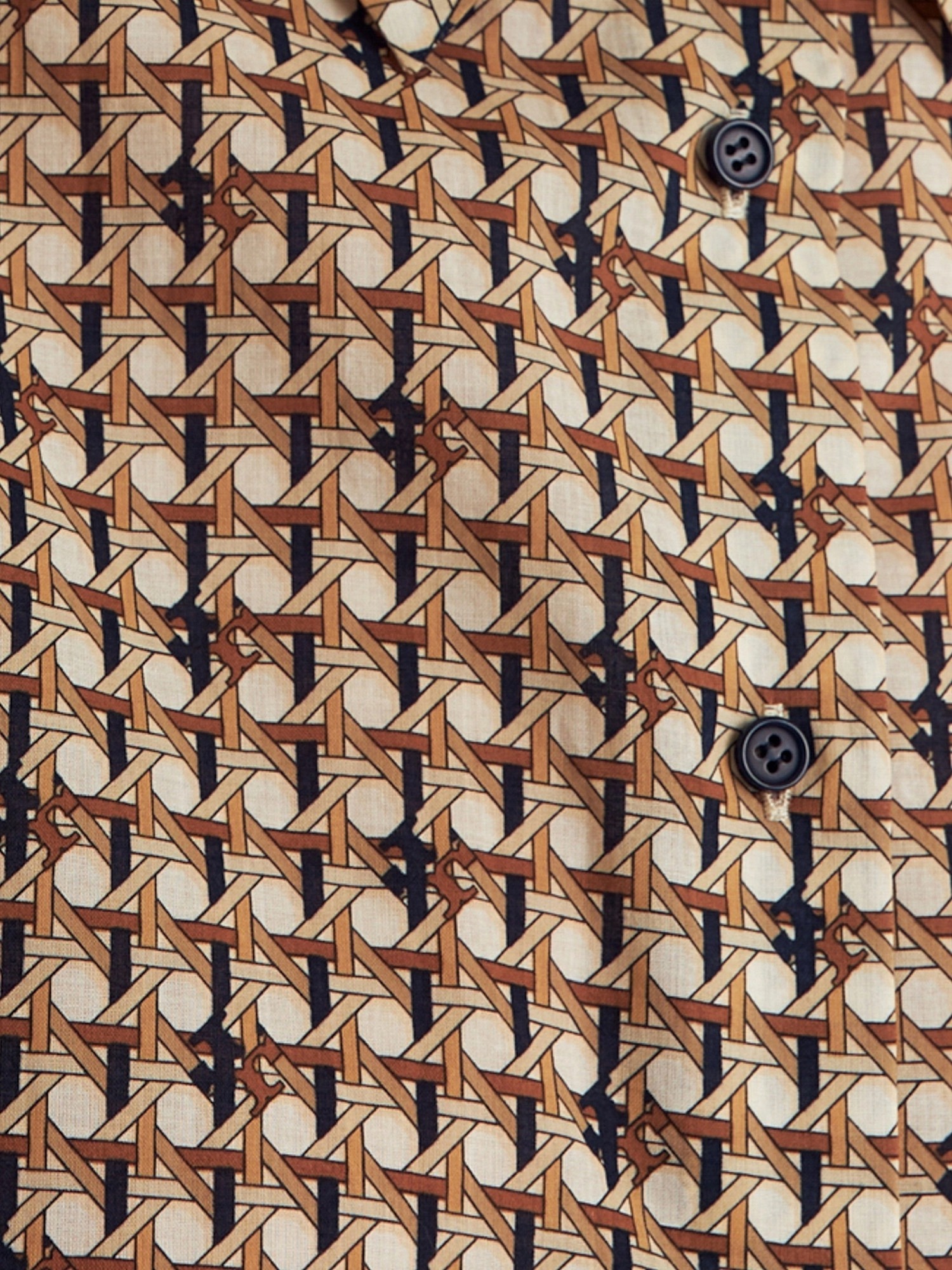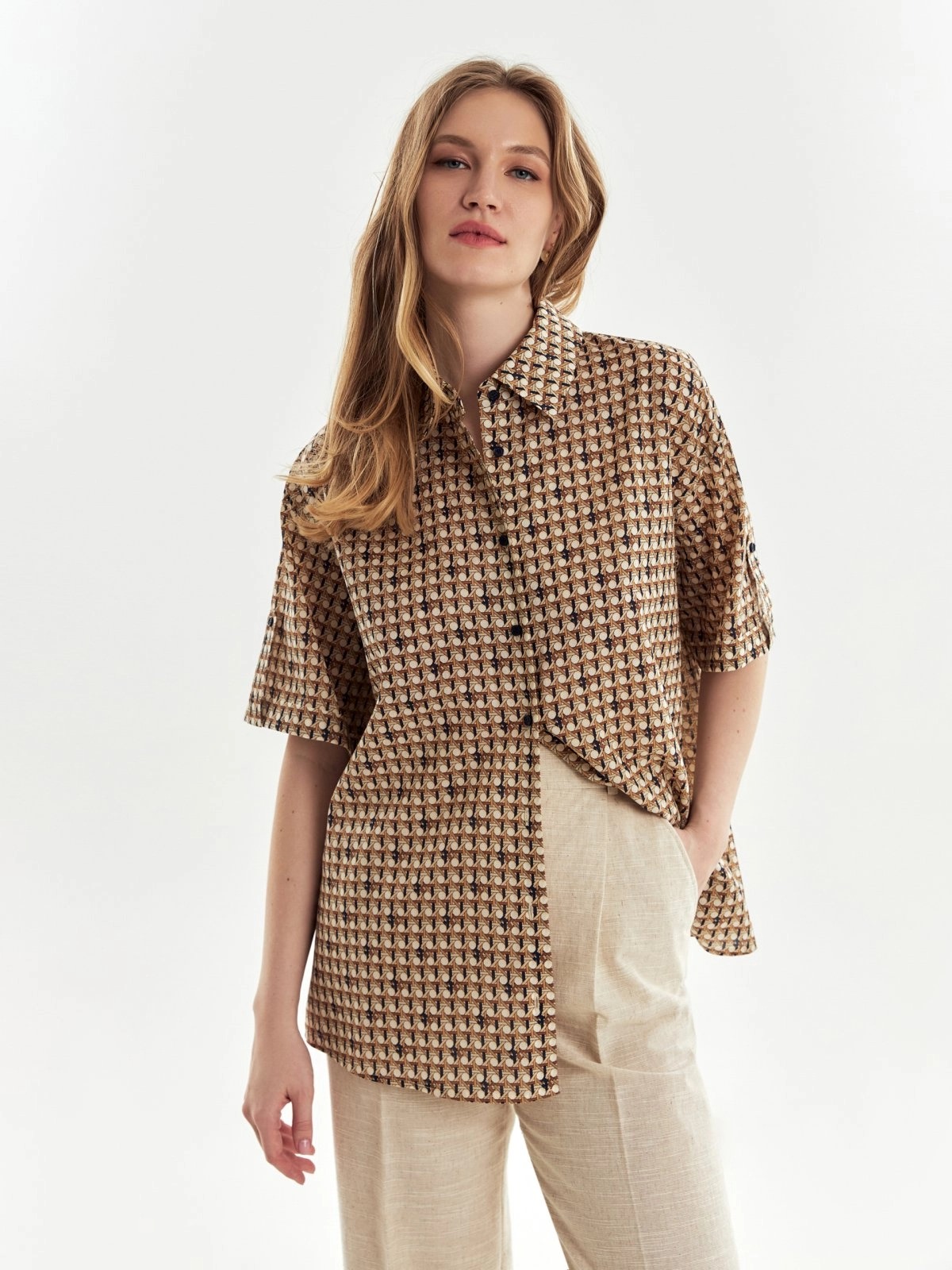 Свободная хлопковая блуза с отложным воротником и планкой в принте идеально впишется в ваш весенний гардероб. Короткий и широкий рукав с патой позволит активно проводить время в городе. По бокам небольшие разрезы.