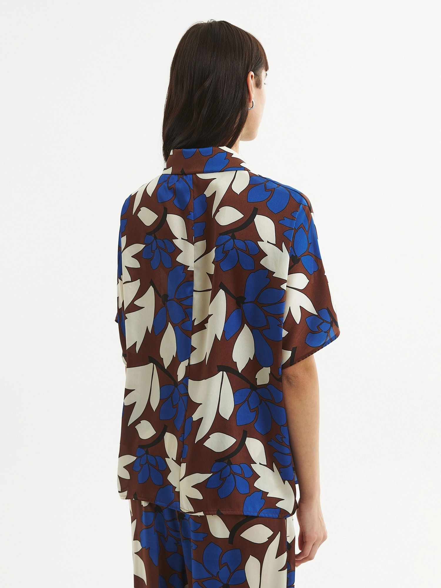 Блуза из плательной ткани с крупным цветочным принтом, прямого силуэта с укороченным рукавом кимоно, классическим отложным воротником и застежкой на пуговицы. По низу по бокам небольшие разрезы.