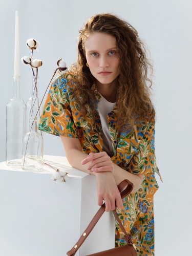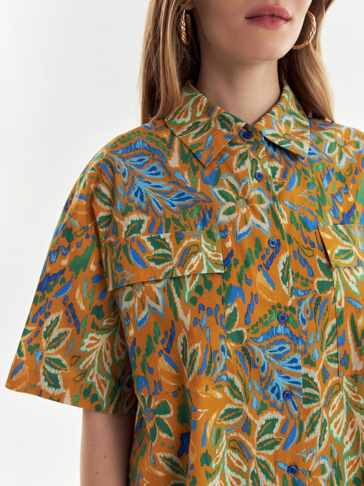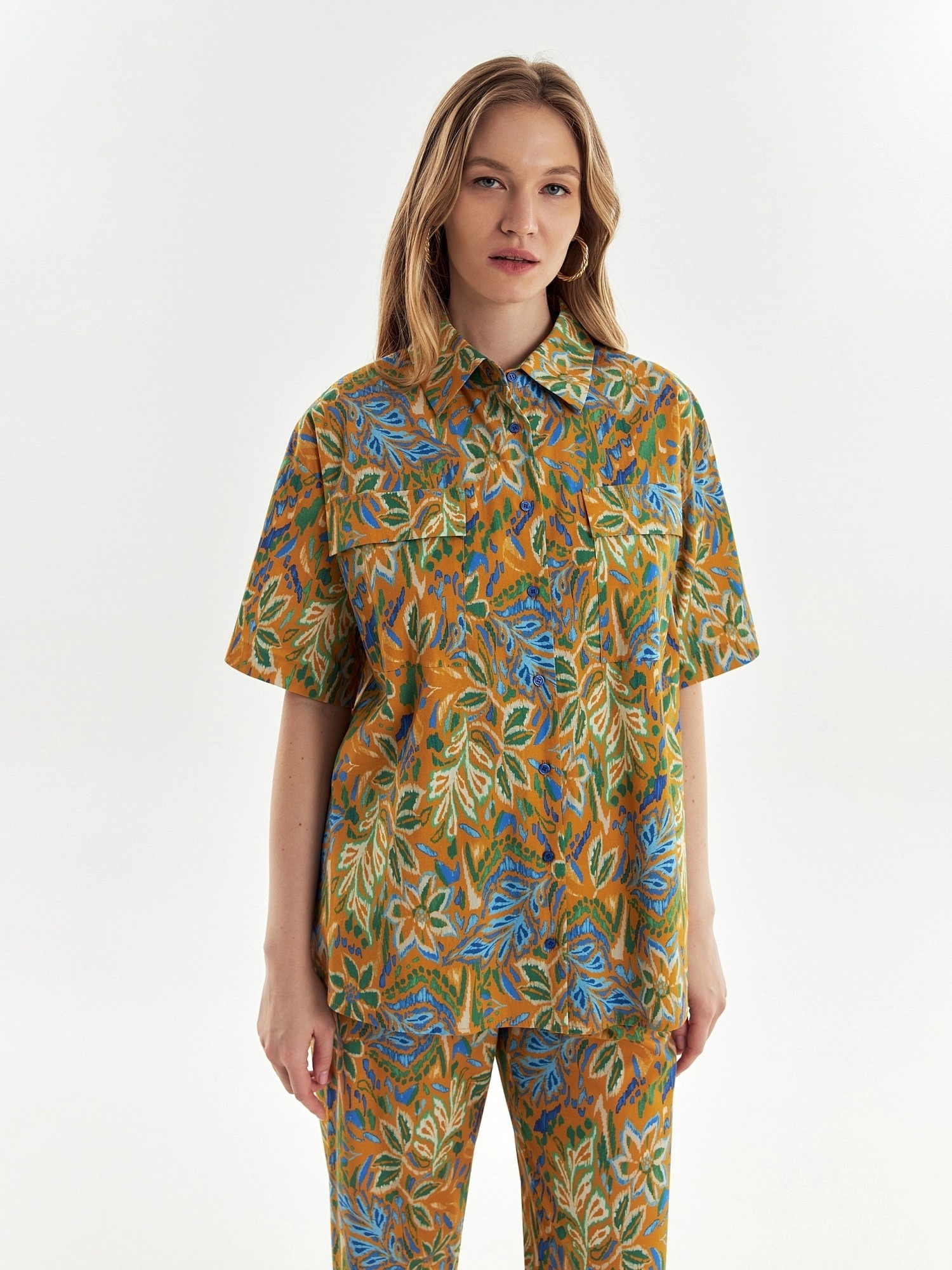 Свободная хлопковая блуза в принте идеально впишется в ваш весенний гардероб. Короткий и широкий рукав позволит активно проводить время в городе. Отложной воротник, застежка на пуговицы. На полочке накладные карманы с клапанами. На спинке кокетка с бантовой складкой. Спинка длине полочки, у блузы есть разрезы по бокам.