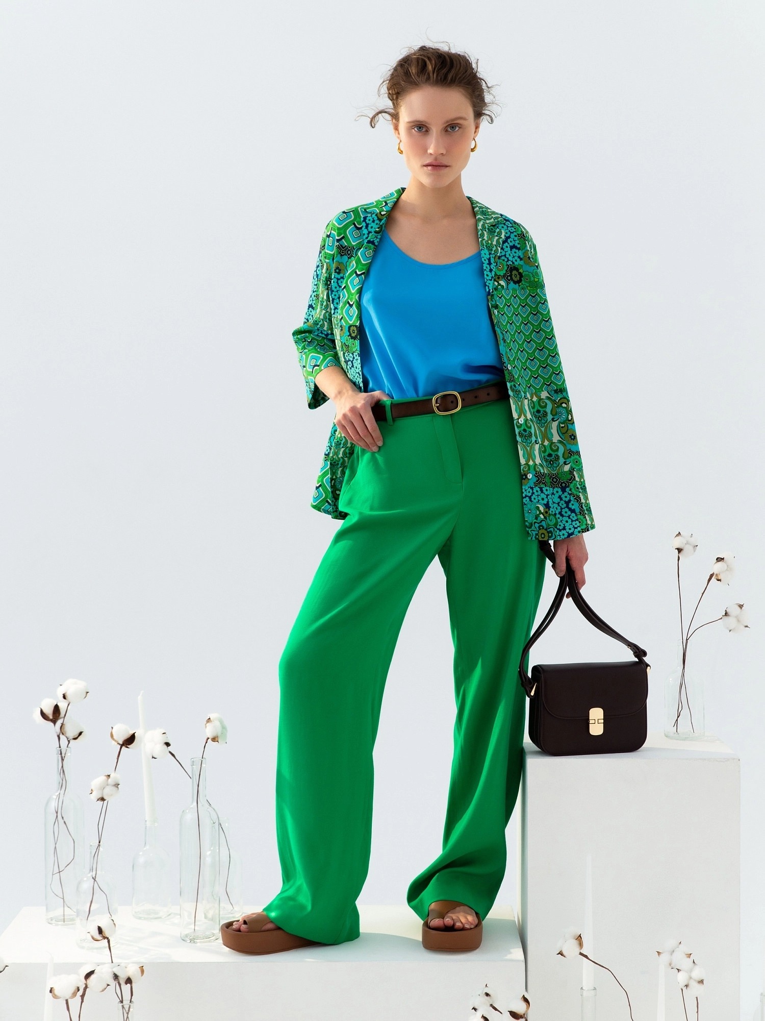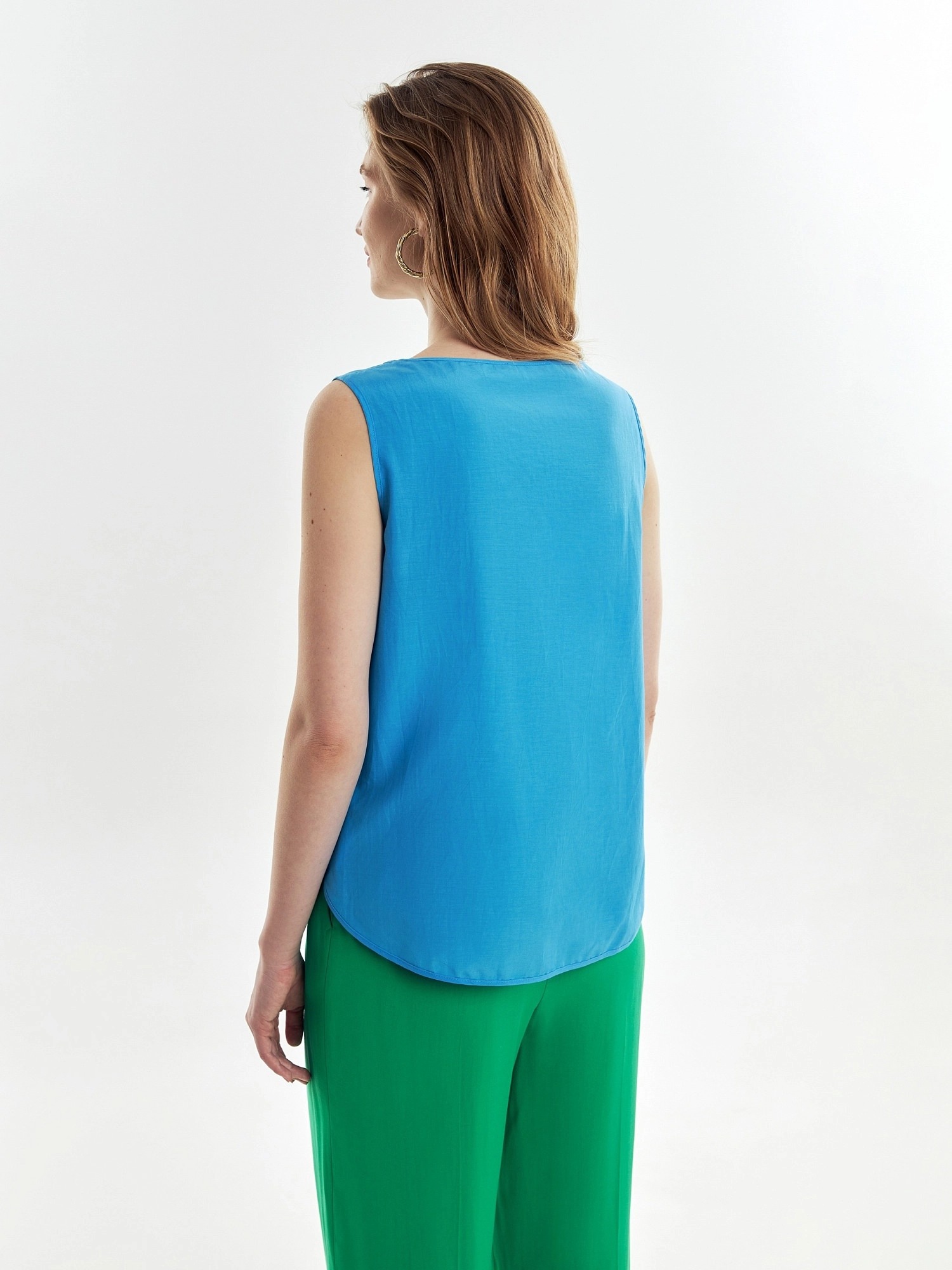 Свободная блуза на широких лямках с глубоким овальным вырезом из блузочной ткани небесно-голубого цвета.