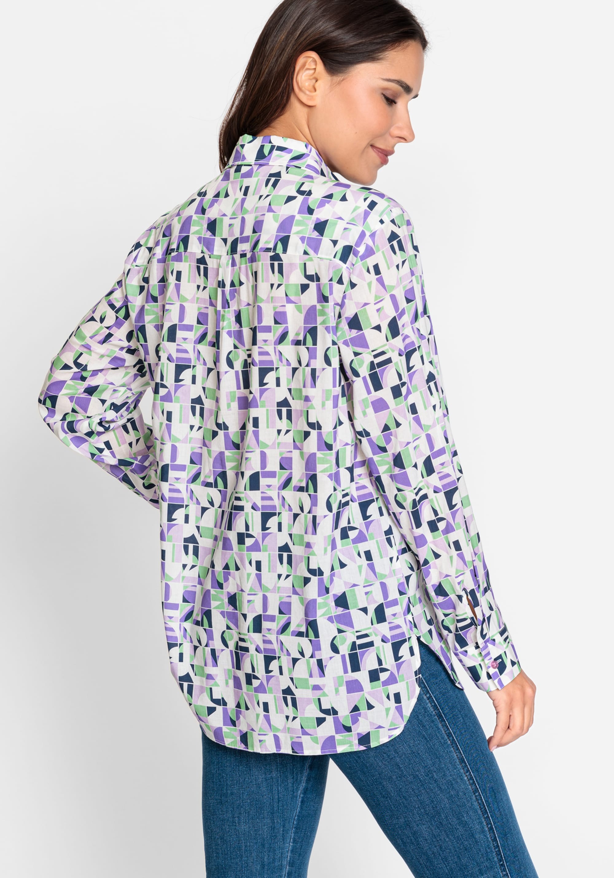 Блуза с ярким геометрическим узором по всей поверхности в пастельных тонах включает в себя классические элементы рубашки, такие как воротник-стойка, застежка на пуговицы спереди и манжеты в вычурном стиле. Сочетание материалов обеспечивает ощущение исключительной легкости и воздушности на коже.