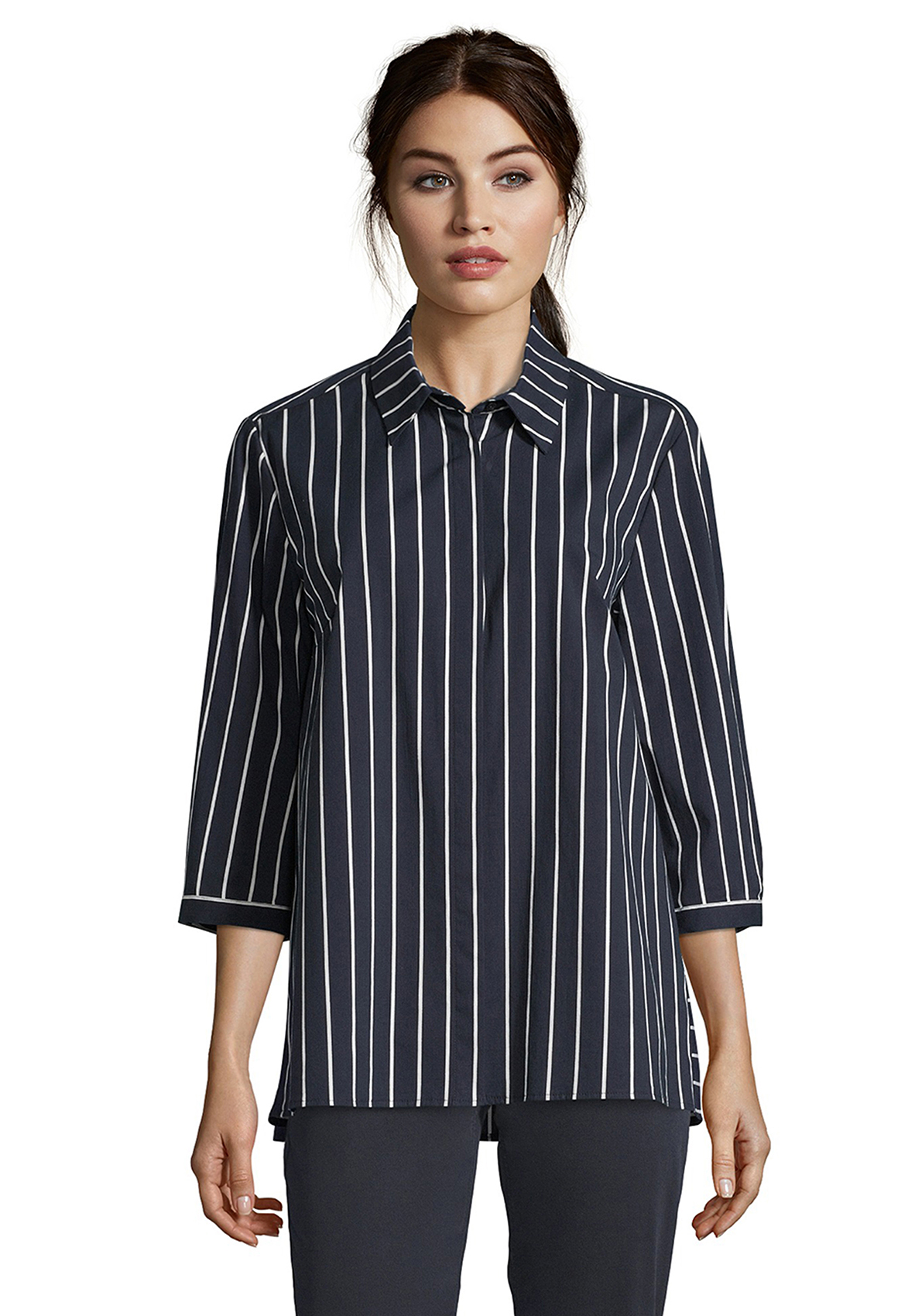 Блуза-рубашка прямого кроя - отличный компаньон для создания образа как в офис, так и на неформальные встречи. Блуза с рубашечным воротником, застежка на пуговицы спереди, рукава 3/4 на манжетах, спинка на кокетке. Принт в вертикальную полоску визуально вытягивает силуэт. Приятный к телу материал из хлопковой смеси обеспечивает комфорт.