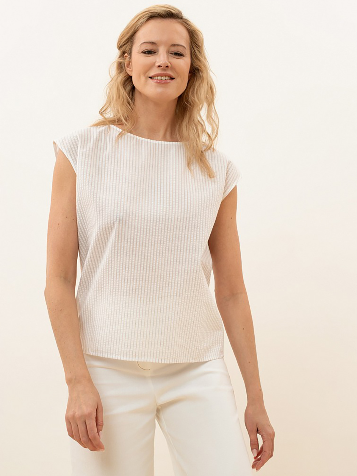 Топ прямого кроя с круглым вырезом из ткани в рубчик молочного оттенка. Топ можно носить навыпуск или заправлять в юбку или брюки с высокой посадкой.