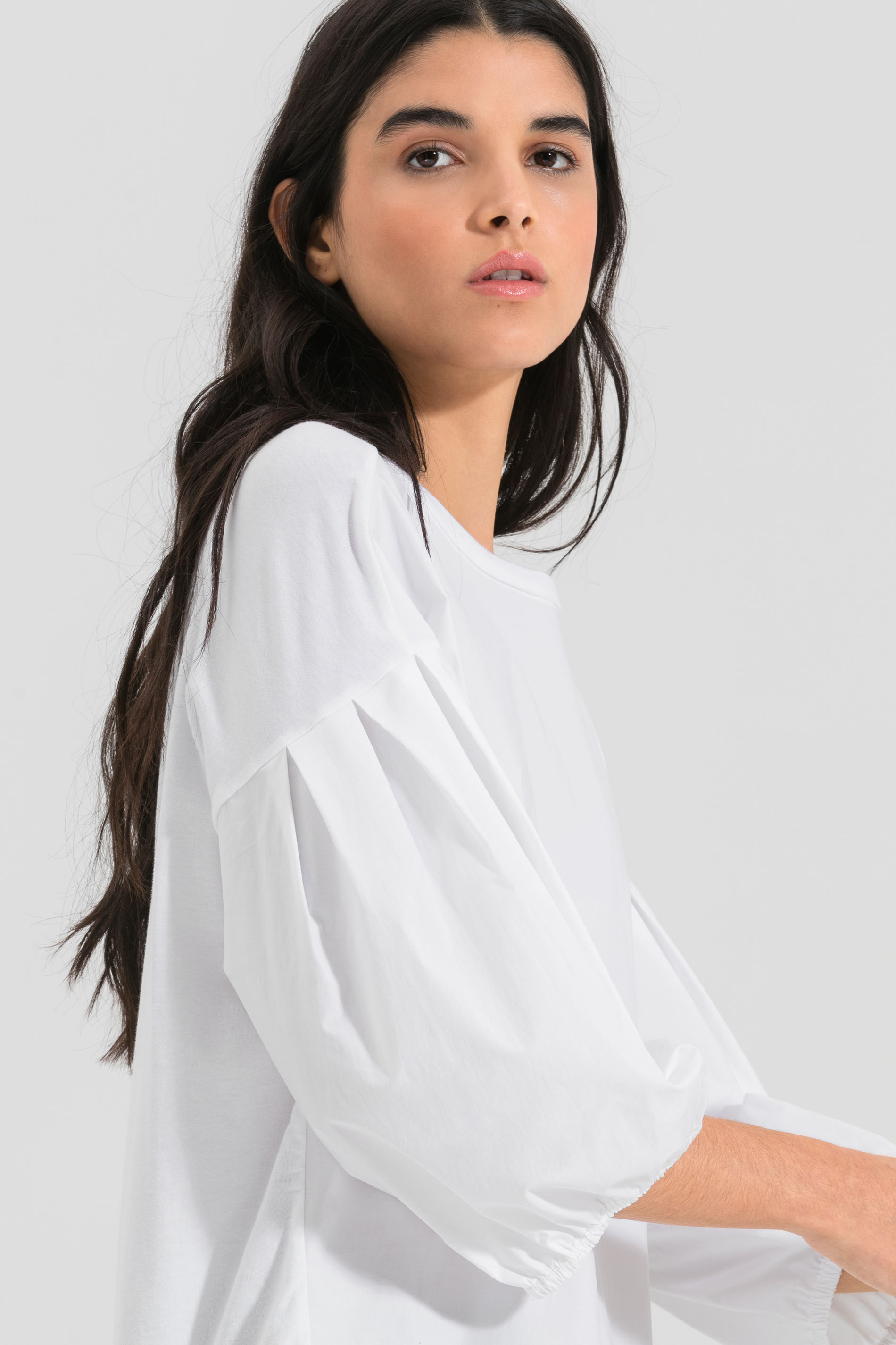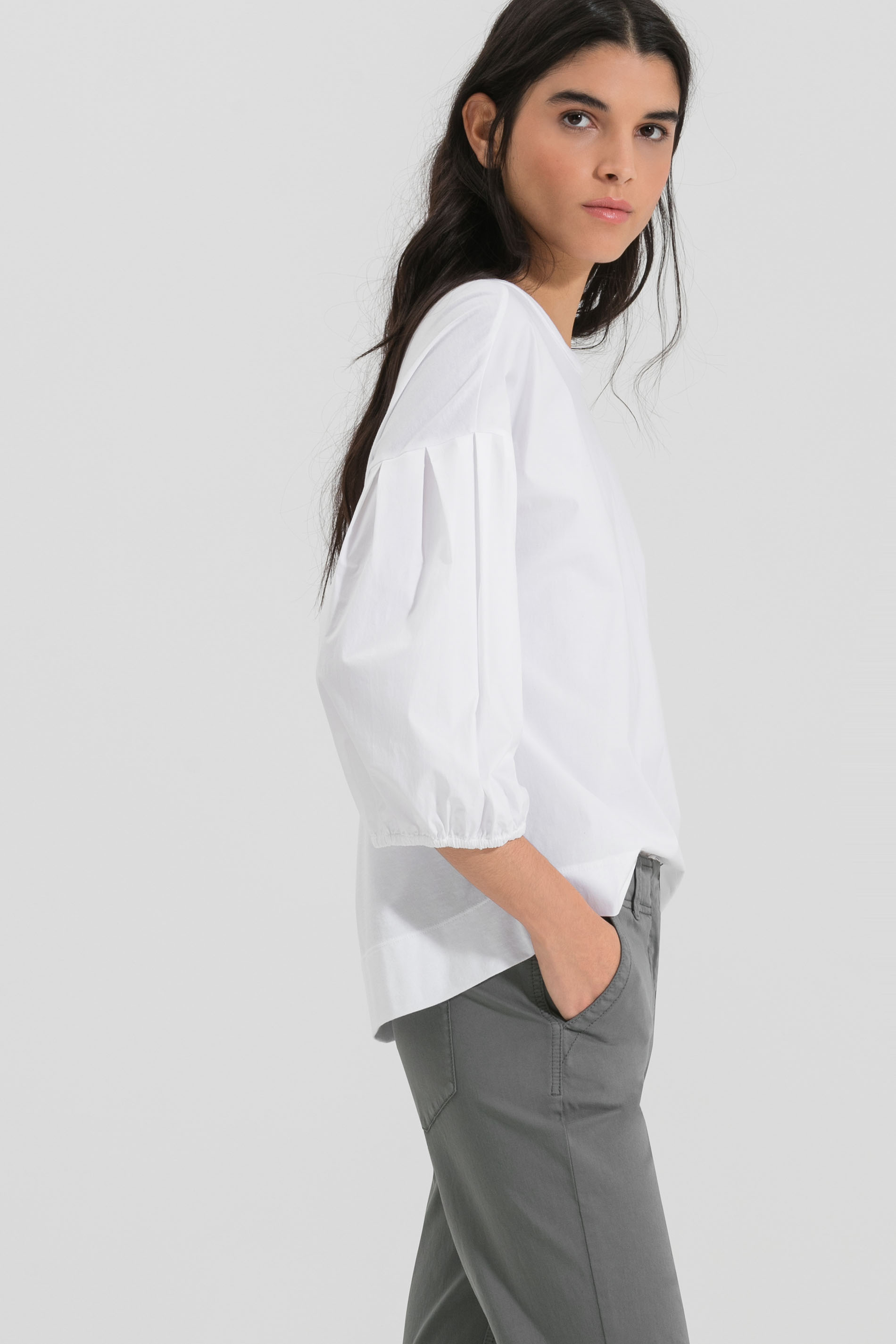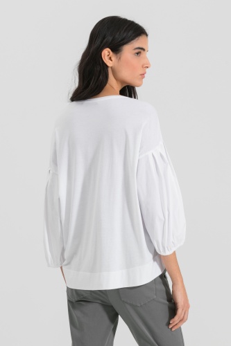 Блуза свободного кроя из смесовой ткани с вырезом-лодочкой, заниженной линией плеч и разрезами по бокам. Объемные рукава украшены декоративными складками и манжетами на резинке.
