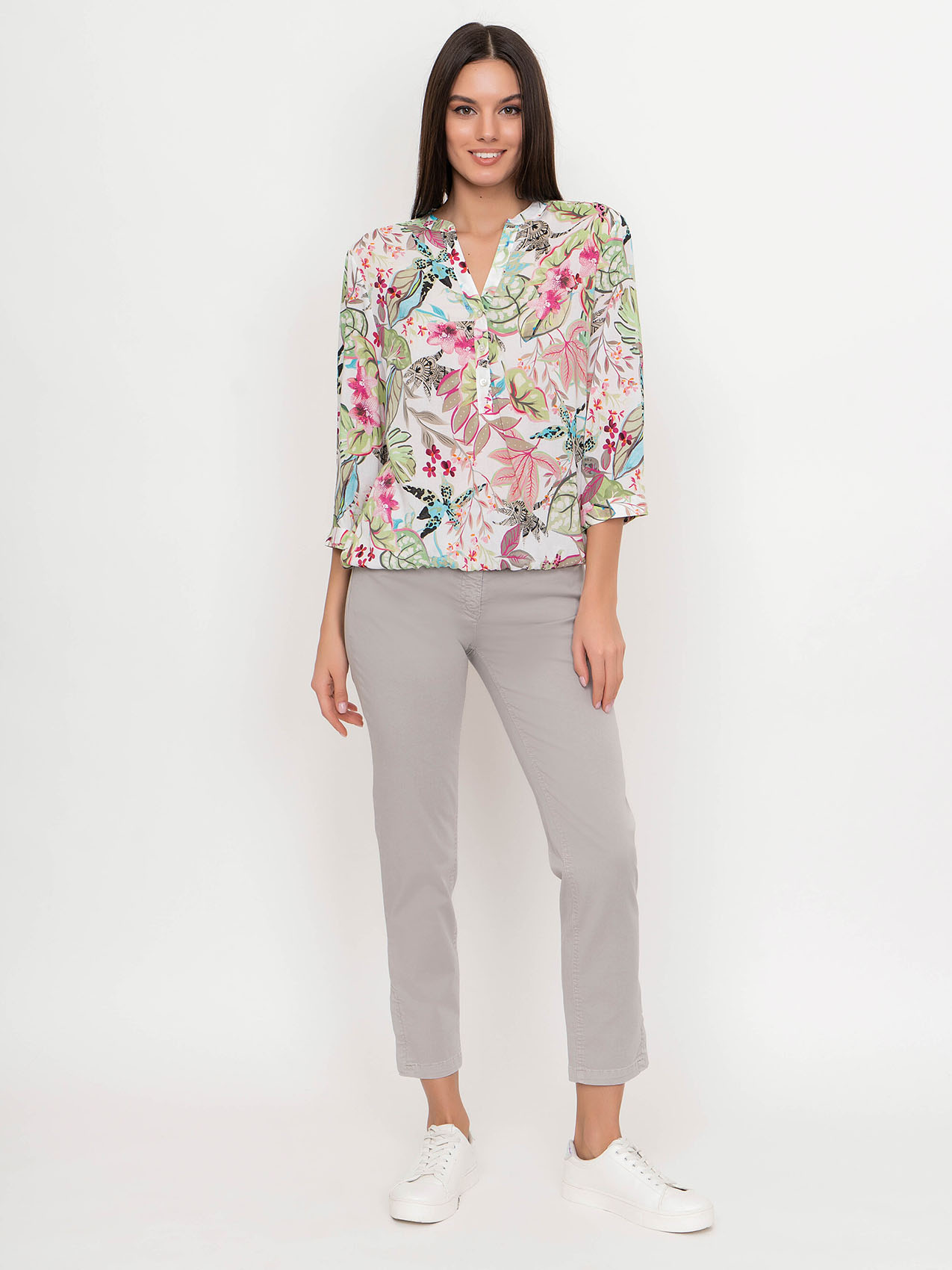Блуза с цветочным принтом создает весеннее настроение. Вискозный материал очень приятен к телу и обеспечивает максимальный комфорт. Прямой покрой гарантирует удобство движений, а рукава 3/4 придают непринужденный вид. Это универсальная и женственная модель, которая преобразит ваш гардероб!