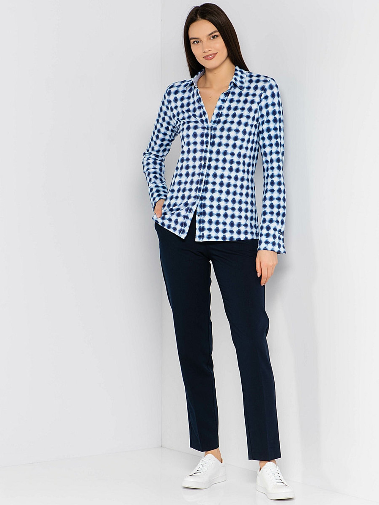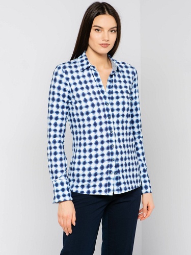 Блузка-рубашка привлекает к себе внимание благодаря трендовому принту батик. Отложной воротничок, V-образный вырез, застежка на пуговицах, длинные рукава с манжетами. Эта женственная модель слегка приталенного силуэта позволит создать множество современных образов!
