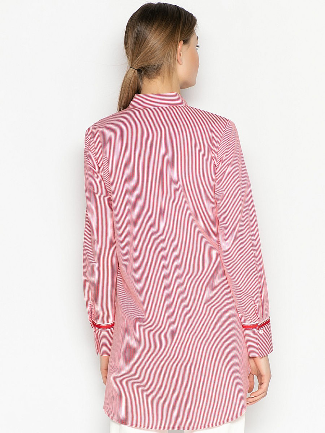 Удлиненная блузка в полоску. Слегка приталенный силуэт, отложной воротничок, застежка на пуговицах, длинные рукава. Отделка тесьмой на рукавах. Хлопковый материал блузки обеспечивает удобство и комфорт. Эта модель будет хороша как с классическими брюками, так и с джинсами.