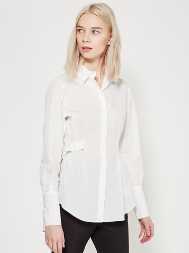 Белая однотонная рубашка прямого кроя. Приталенный силуэт за счет ремешков на талии. Втачной рукав полной длины с широкими манжетами на пуговицах. Отложной рубашечный воротник, супатная застежка.