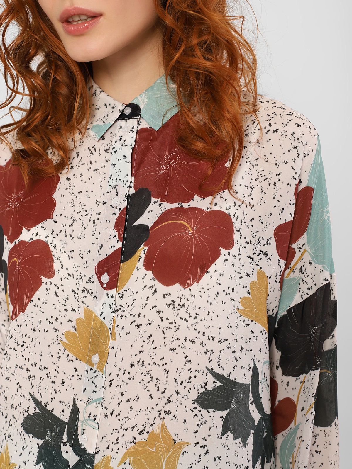 Блуза из смеси вискозы и шелка прямого удлиненного силуэта с классическим отложным воротником, спущенным плечом и втачным рукавом на манжете. Застежка спереди на пуговицы. Низ спинки удлиненный и закругленный, по бокам разрезы.