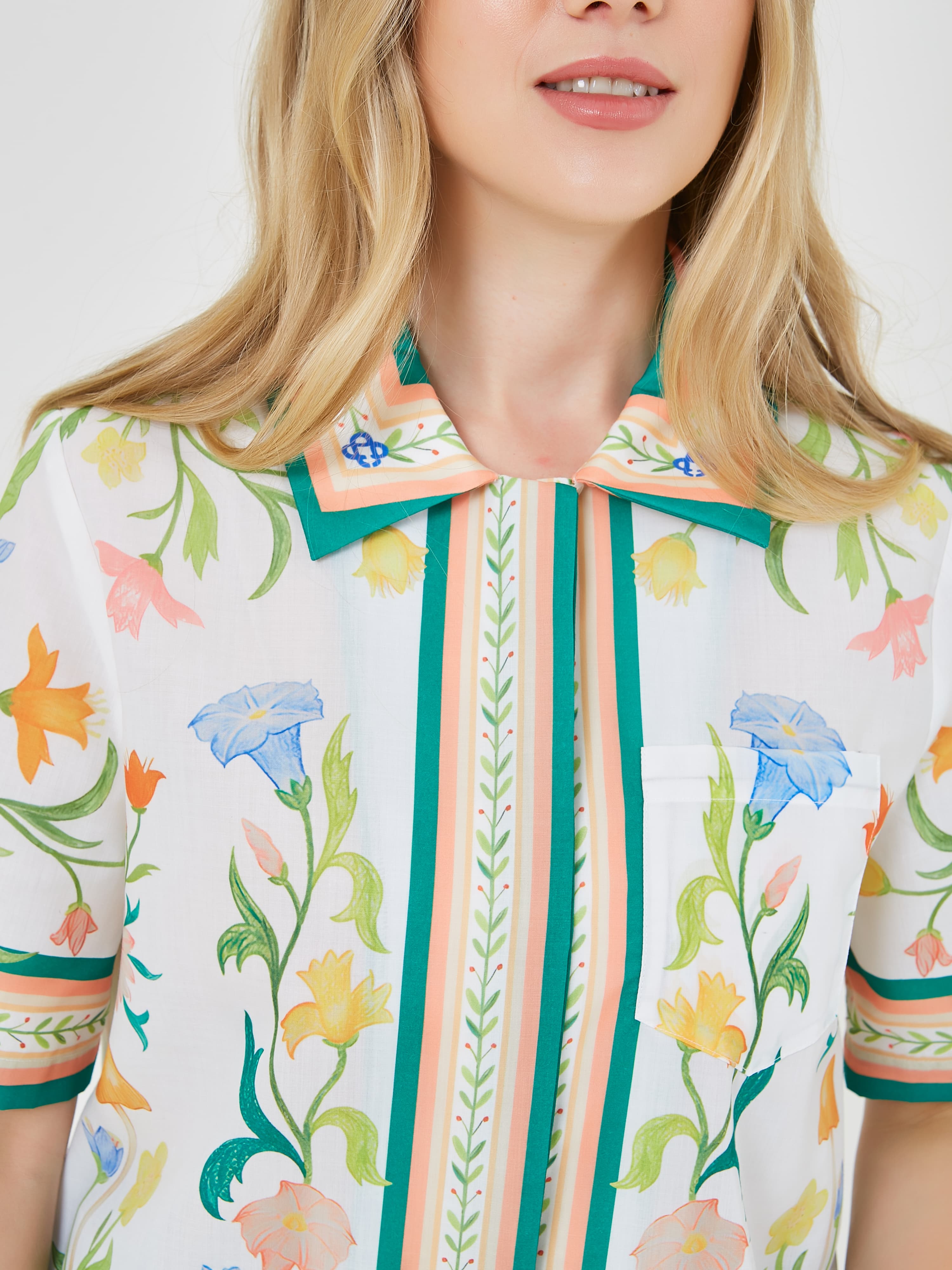 Женская рубашка с короткими рукавами и спрятанными пуговицами. Принт в виде цветов и листьев в теплых тонах расположен в рамках на рубашке. Коллекция Весна-Лето 2025. Капсула "Марракеш". Параметры модели: 89-70-92, рост 167, размер 44-46