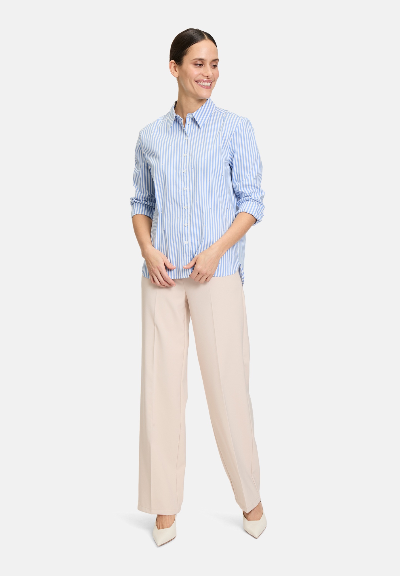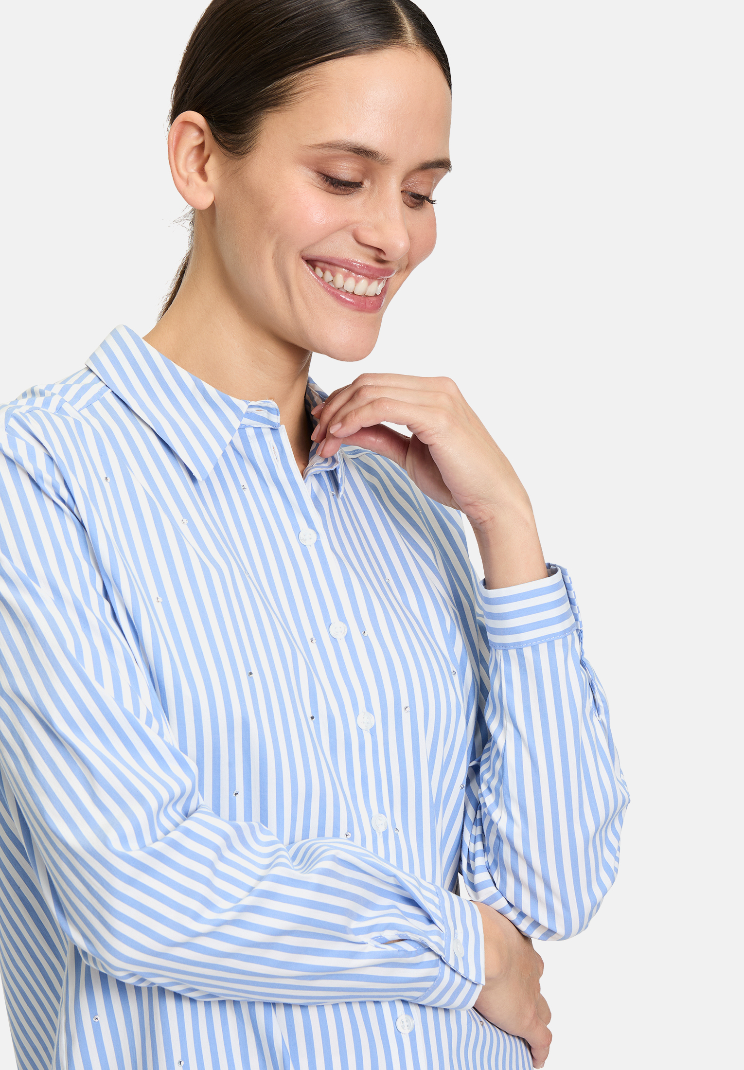 Повседневная блузка-рубашка с рубашечным воротником привнесет классический стиль в ваш гардероб. Полосатый рисунок и стразы придают блузке современный и свежий вид, а свободный крой обеспечивает высокий комфорт. Планка с пуговицами позволяет индивидуально подогнать блузку. Блузка идеально подходит для повседневных нарядов для отдыха, ее можно комбинировать различными способами, и она придаст любому образу непринужденную элегантность.