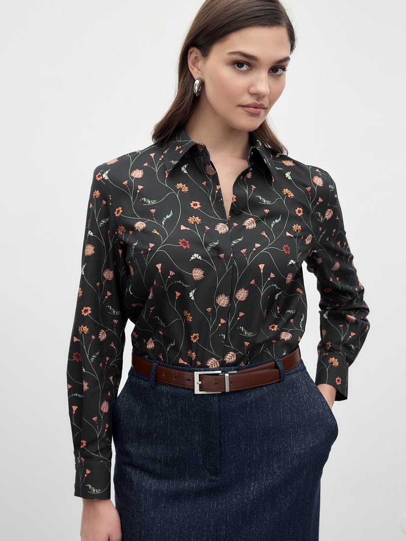 Прямая удлиненная блуза из принтованной хлопковой ткани, с классическим отложным воротником и супатной застежкой на пуговицы. Рубашечный широкий рукав на узком манжете. На спинке кокетка со складкой.