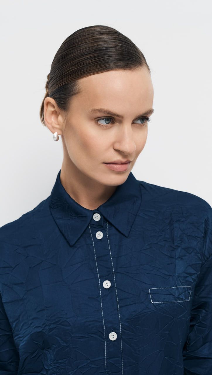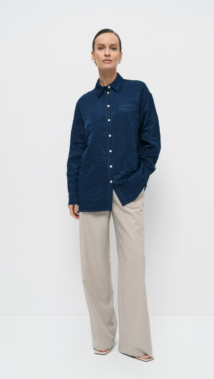 Темно-синяя блуза прямого удлиненного силуэта выполнена из мягкой, приятной на ощупь вискозы с мятым эффектом. Центральная застежка на 7 петель и 7 пуговиц, расположенная по центру переда, придает блузе элегантность и классический вид. Отложной воротник с отрезной стойкой подчеркивает линию шеи и добавляет изюминку в образ.
