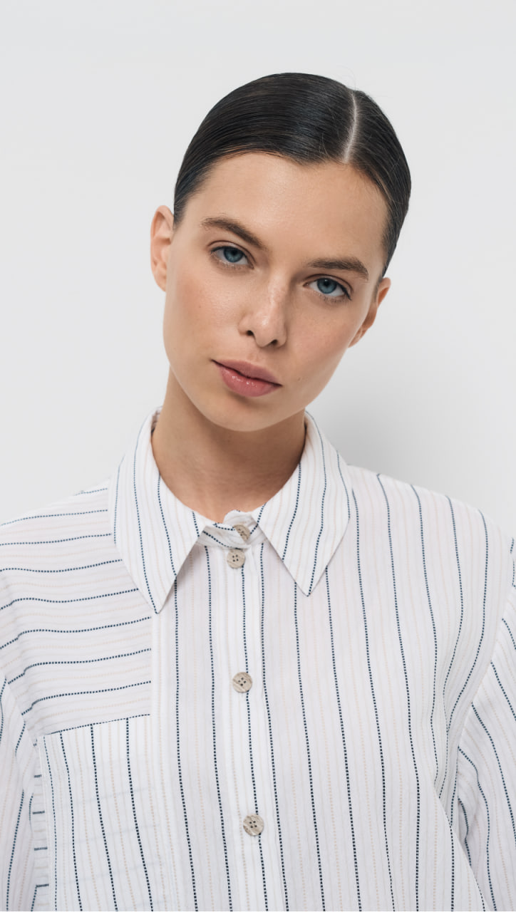 Блуза свободного силуэта выполнена из вискозы с вертикальными полосками, которые придают изделию стильный и современный вид. Цвет "белая амбра" отвечает за чувство свежести и чистоты.