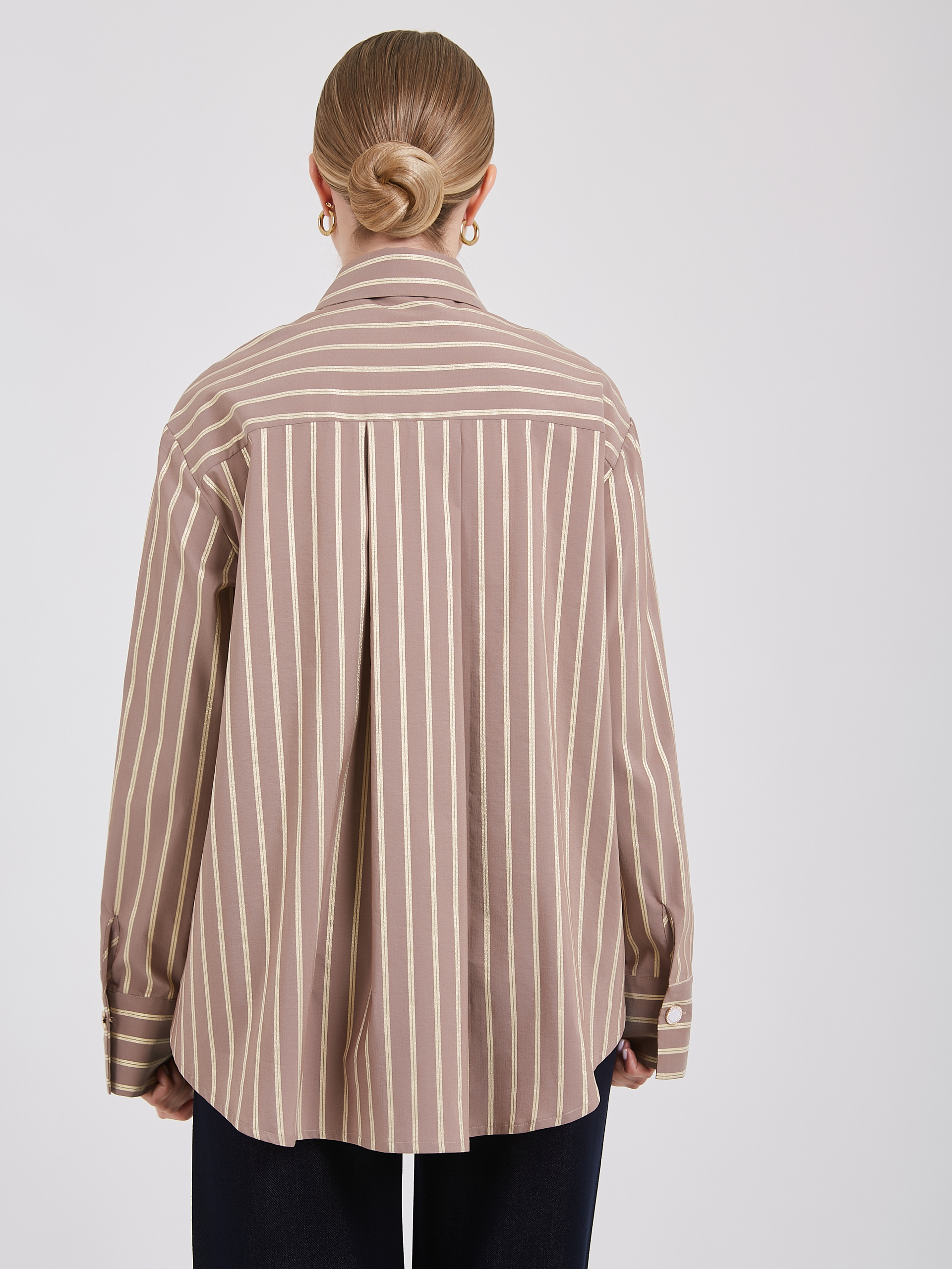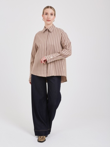 Коричневая полосатая рубашка классического стиля. Тонкие вертикальные полоски цвета слоновой кости придают изделию изысканный и утончённый вид. Классический воротник и длинные рукава с манжетами подчёркивают элегантность и универсальность модели. Прочная ткань высокого качества обеспечивает комфорт и долговечность, идеально дополняя повседневные и офисные образы.