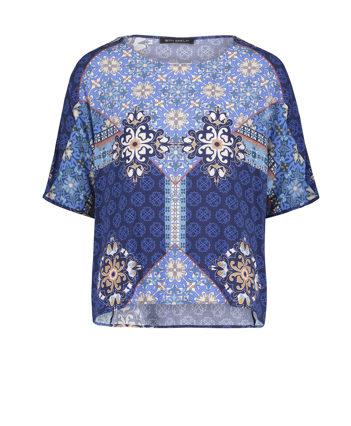 Свобода в тренде! Блуза свободного покроя с этническим орнаментом. Широкий круглый вырез горловины, рукава 1/2. Вискозный материал приятен к телу и обеспечивает максимальный комфорт. Эта модная блуза - отличный компаньон для любого однотонного варианта низа, будь то брюки или юбка.