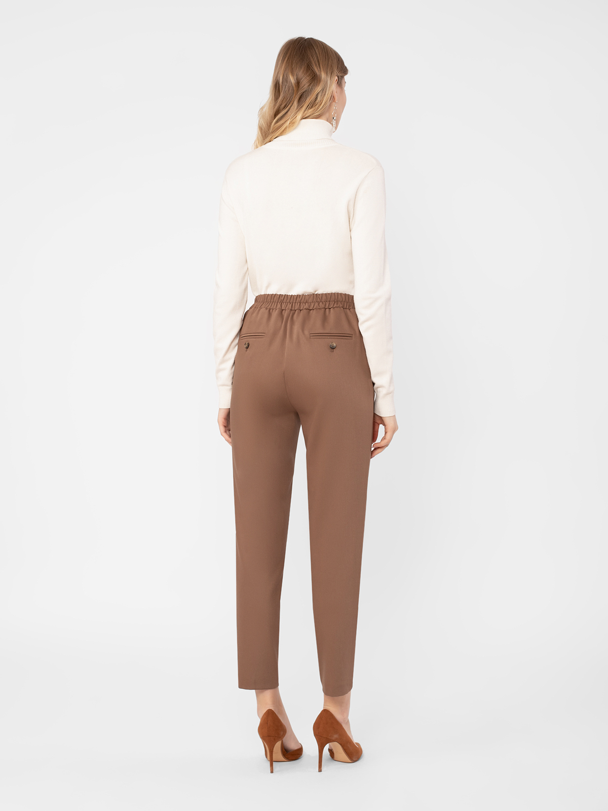 Брюки в стиле кэжуал, зауженные к низу, длина 7/8. Средняя посадка. Пояс на резинке. Спереди заложены складки. Боковые карманы рабочие.