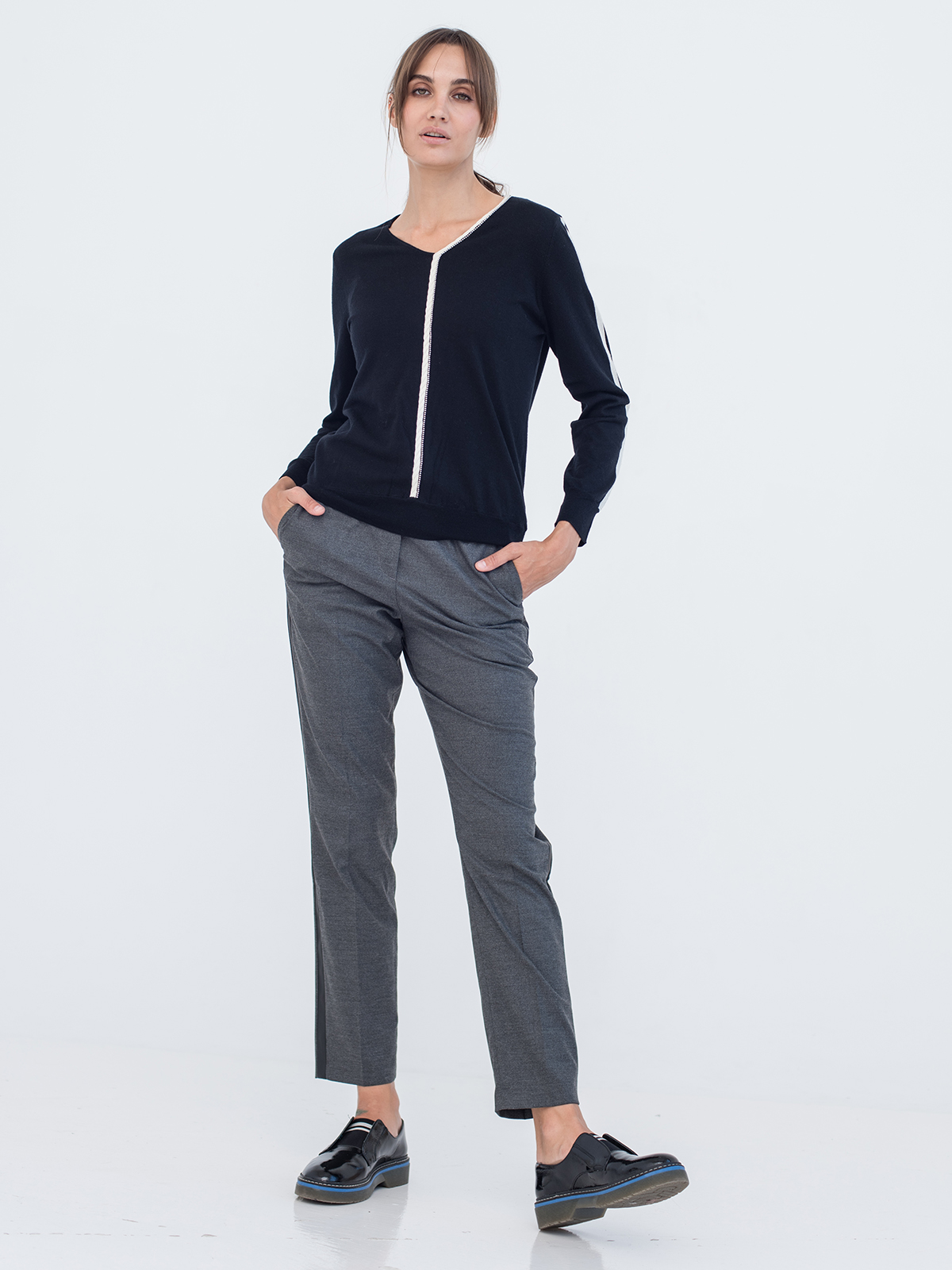 Прямые однотонные брюки с лампасами – оригинальный дизайн, выдержанный в деловом стиле. Комфортная средняя посадка, эластичный пояс с кулиской гарантируют удобство ношения. Приятный к телу материал. Трендовая длина 7/8. Брюки хорошо сочетаются с рубашкой, джемпером или блейзером.