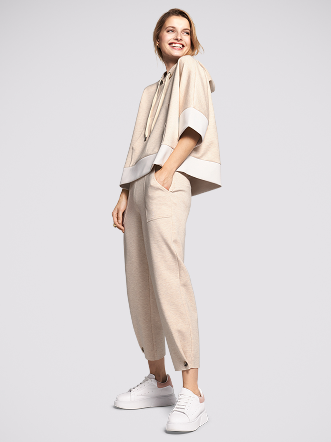 Укороченные брюки в спортивном стиле из смесовой вискозы. Широкий эластичный пояс с кулиской. Пуговицы по низу штанин, накладные карманы.
