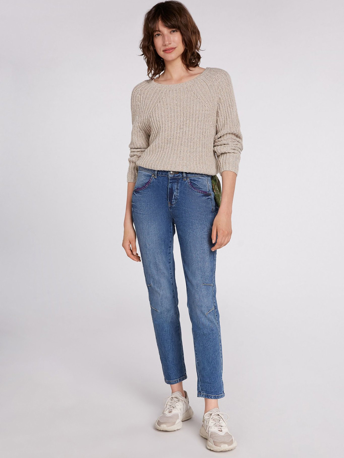 Укороченные джинсы с потертостями и декоративными вытачками на коленях. Комфортная средняя посадка, притачной пояс со шлевками. В комплекте идет стильный платок, который рекомендуется повязывать на одну из шлевок в качестве акцентной детали. Рост модели 178 см, ее размер – 42 (российский).